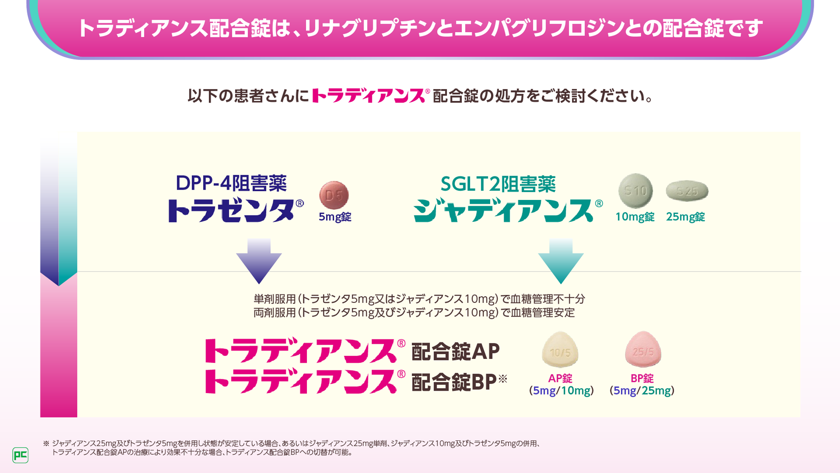 ジャディアンスとDPP-4阻害薬 トラゼンタの配合剤である、トラディアンス配合錠APとトラディアンス配合錠BPがあります。ただし、トラディアンス配合錠の適応は2型糖尿病※4のみであることに留意してください。