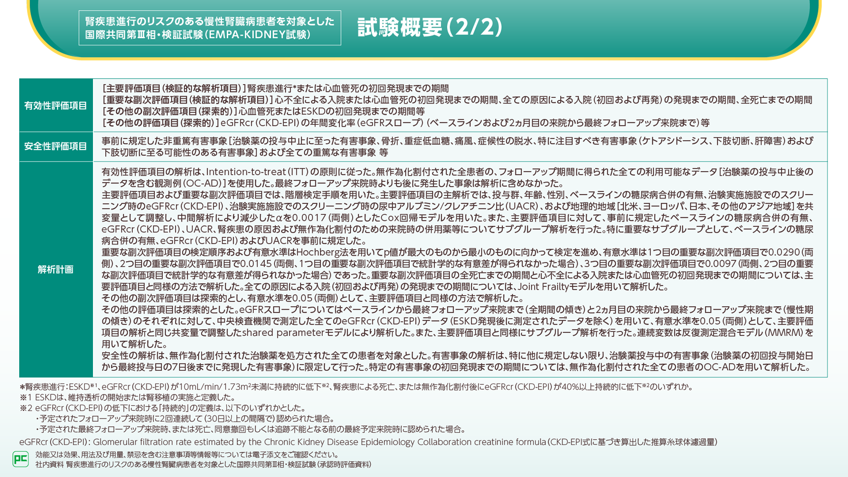 今回は、2024年2月にCKD※2に対する効能又は効果が新たに追加承認されたジャディアンス10mgの基本情報と、本剤の有効性および安全性を評価した国際共同第Ⅲ相試験(EMPA-KIDNEY試験)についてご紹介しました。