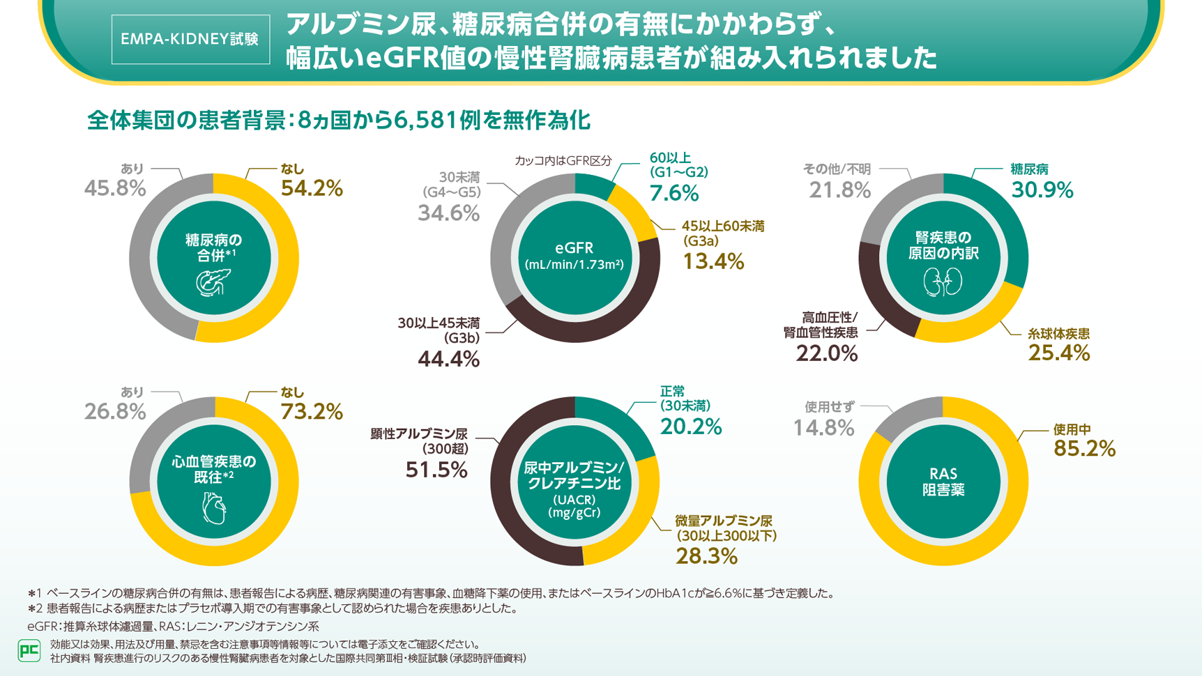 また、本試験の患者背景はご覧のとおりであり、アルブミン尿、糖尿病合併の有無にかかわらず、幅広いeGFR値のCKD患者が組み入れられました。