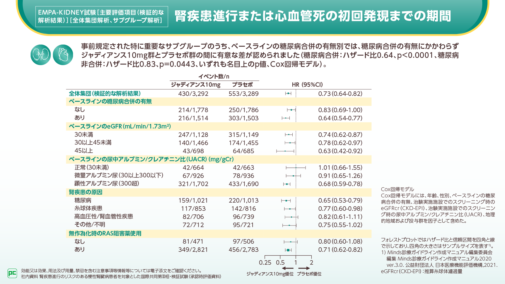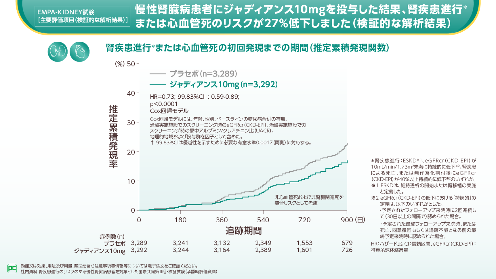 本試験では、CKD患者にジャディアンス10mgを投与した結果、主要評価項目である腎疾患進行または心血管死のリスクは、ジャディアンス10mg群で27%低下し、プラセボ群に対するジャディアンス10mgの優越性が検証されました。