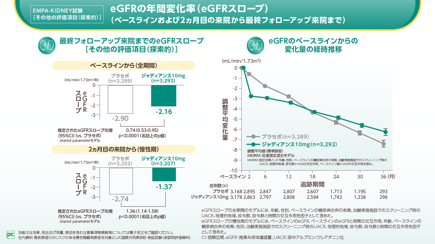 その結果、ベースラインから最終フォローアップ来院までの全期間で、ジャディアンス10mg群-2.16mL/min/1.73m2/年、プラセボ群-2.90であり、2ヵ月目の来院から最終フォローアップ来院までの慢性期では、ジャディアンス10mg群-1.37、プラセボ群-2.74でした。
