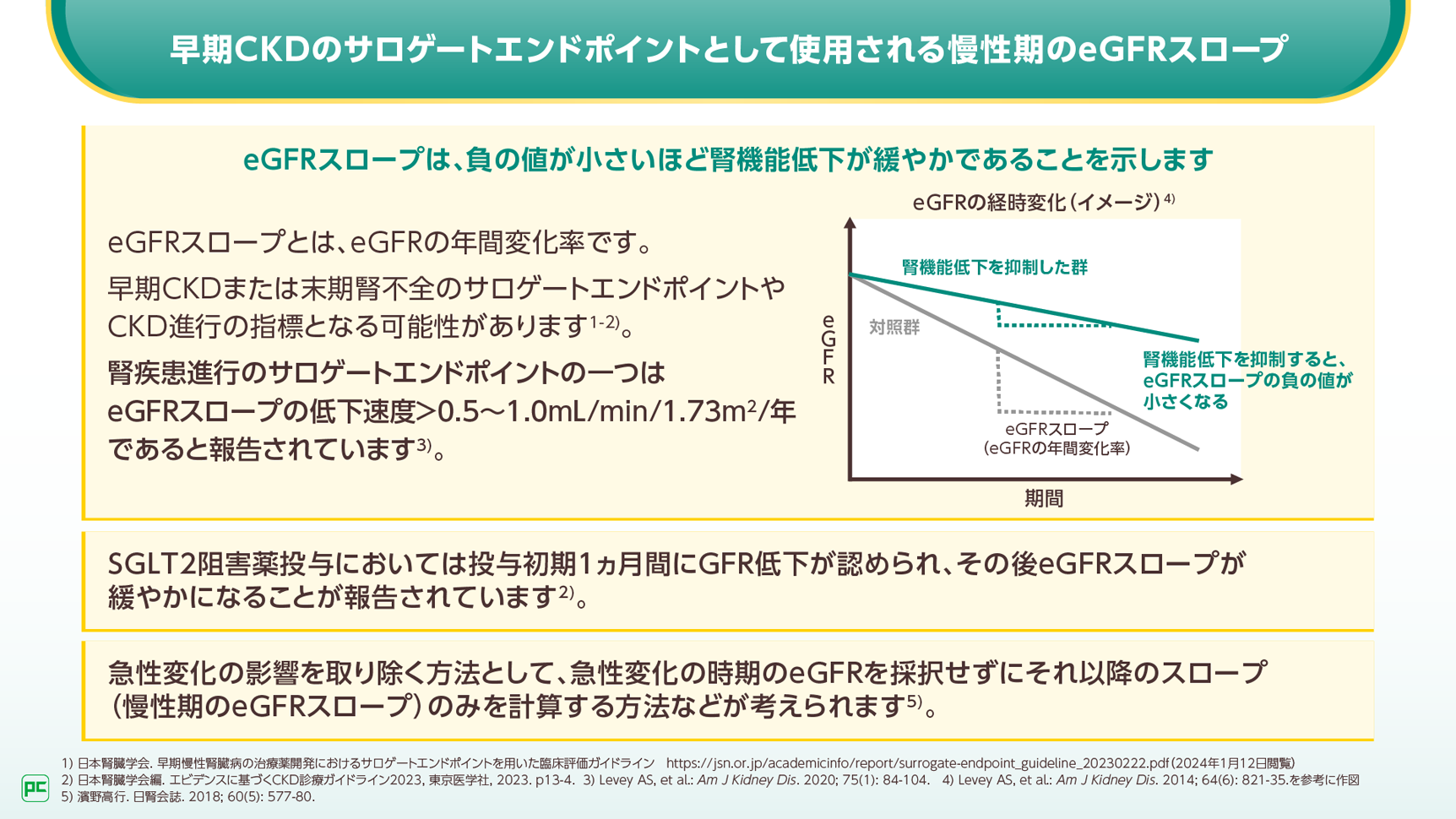 また、eGFRスロープの低下速度が0.5~1.0mL/min/1.73m2/年 より大きいことが、腎疾患進行のサロゲートエンドポイントのひとつであるとの報告もあります。