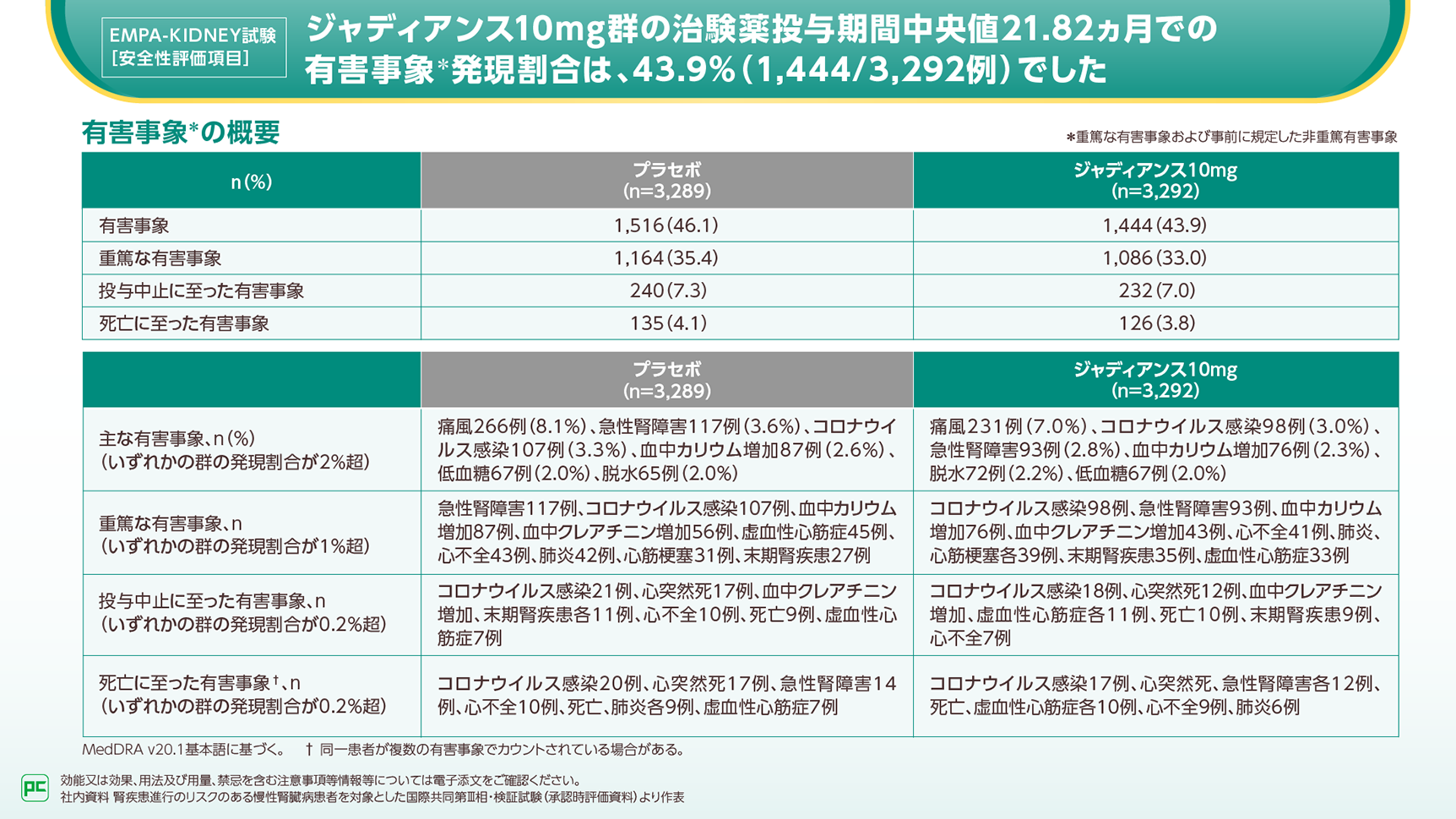 治験薬投与期間中央値21.82ヵ月での有害事象発現率は、ジャディアンス10mg群43.9%(1,444/3,292例)、プラセボ群46.1%(1,516/3,289例)でした。