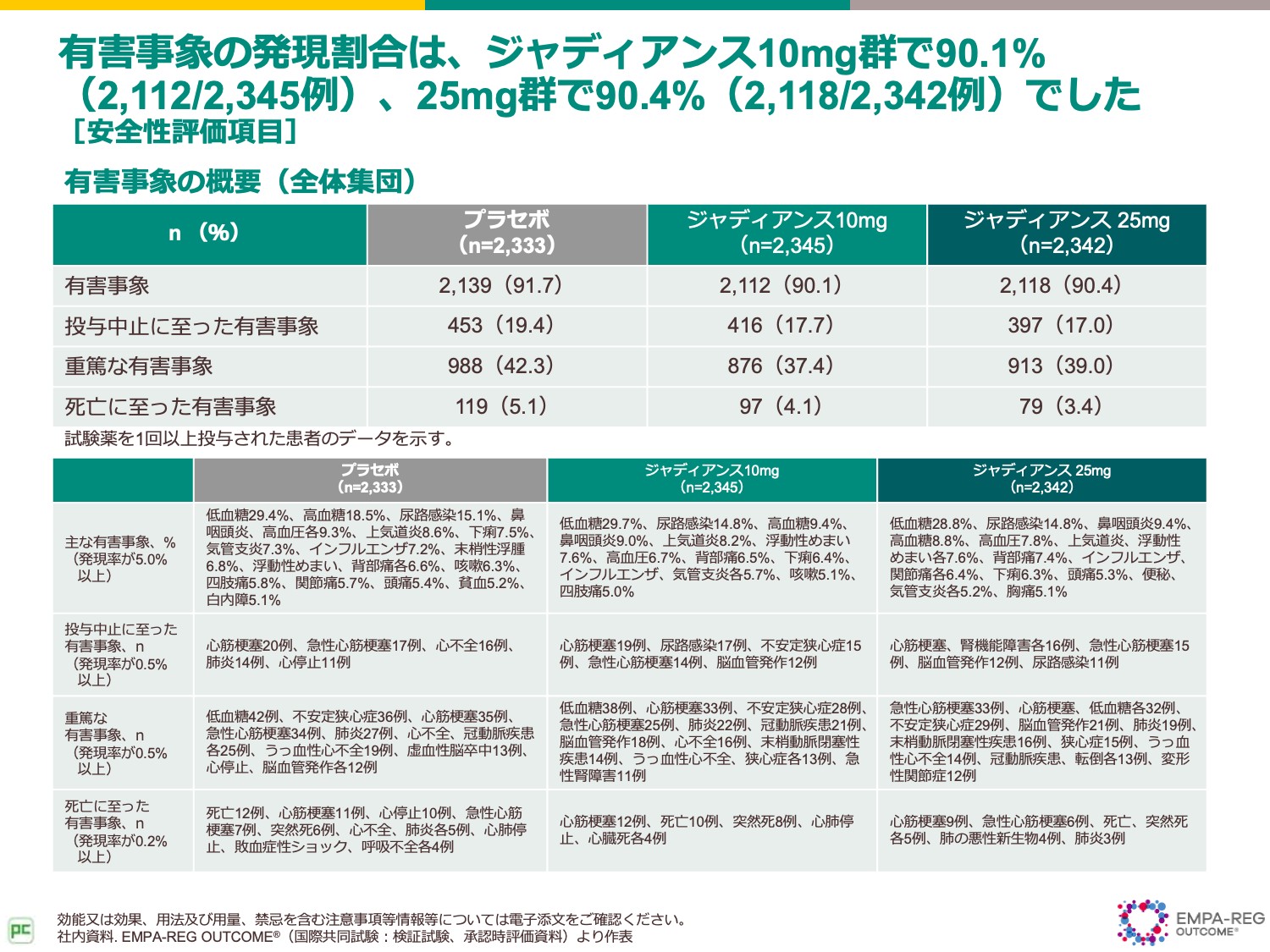 また、重篤な有害事象は、ジャディアンス10mg群で低血糖38例、心筋梗塞33例、不安定狭心症28例等であり、ジャディアンス25mg群で急性心筋梗塞33例、心筋梗塞32例、低血糖32例等でした。