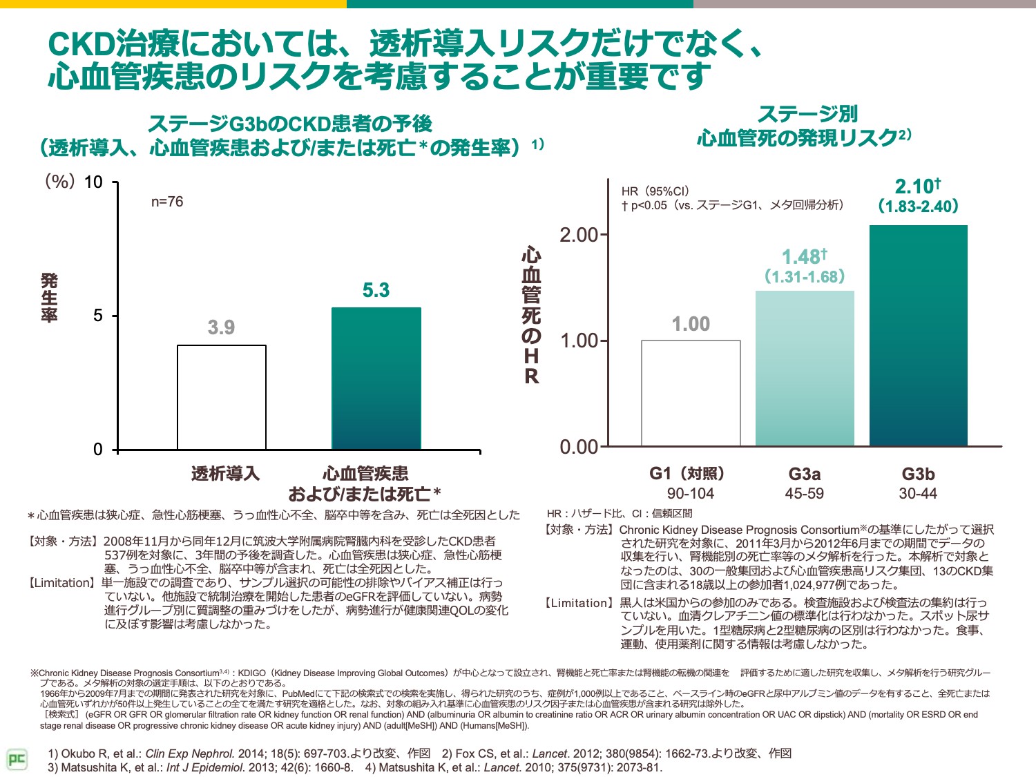 以上のデータから、CKD治療においては透析導入リスクだけでなく、心血管イベントリスクも考慮した治療選択が重要ではないかと考えられます。