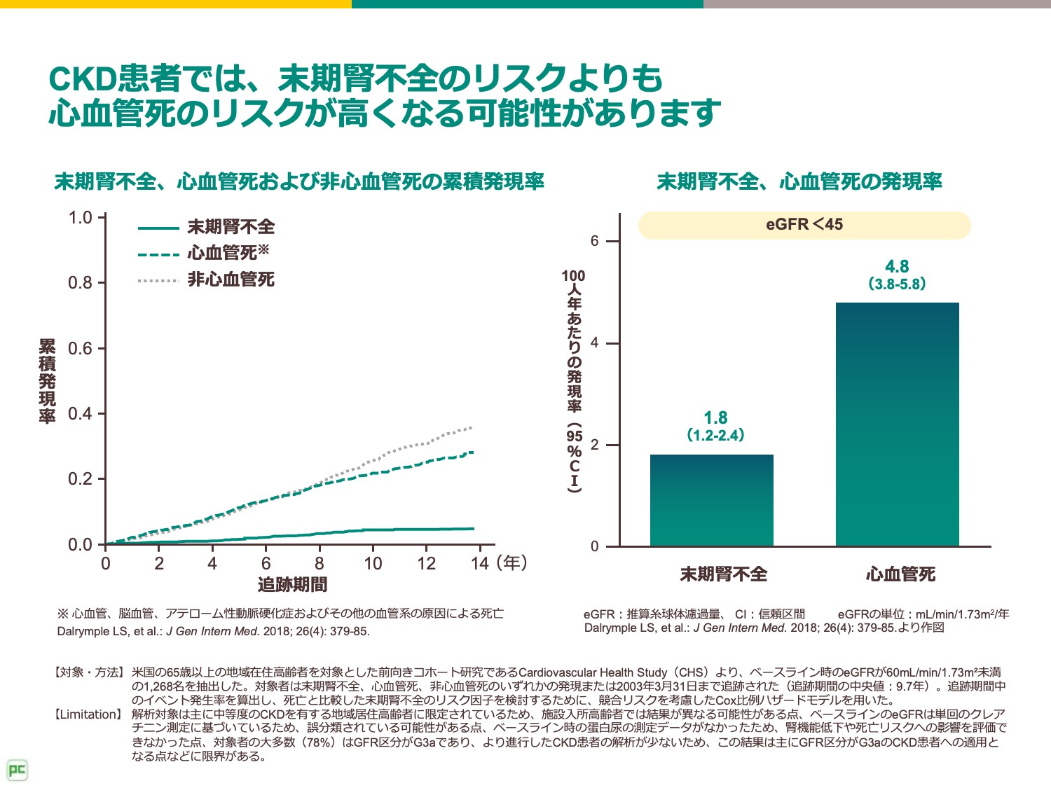 また、右側のグラフでは、腎臓専門医が診察するケースも多いと考えられるeGFR45mL/min/1.73m2未満の患者において、心血管死の100人年あたりの発現率は4.8と、末期腎不全への進行の約2.7倍の頻度であることが示されています3)。