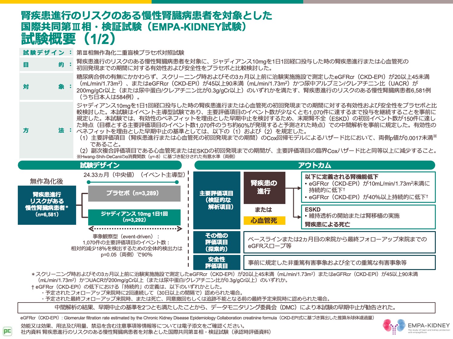 EMPA-KIDNEY試験5)は腎疾患進行のリスクのある慢性腎臓病患者を対象に、ジャディアンス10mgを1日1回経口投与した時の腎疾患進行または心血管死の初回発現までの期間に対する有効性および安全性を、プラセボと比較検討した試験です。