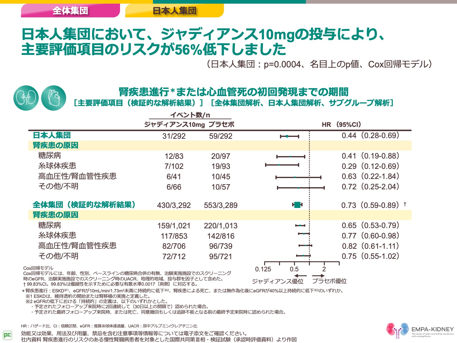 そして副次評価項目である心血管死、全死亡、心不全による入院、これらいずれの項目においても、プラセボ群に対してジャディアンス群で有意なイベントリスク抑制が示されました。