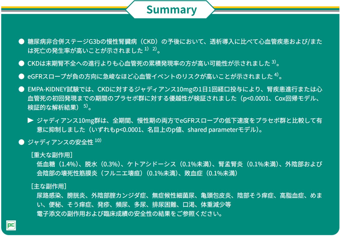 今回は2型糖尿病を併発していないステージG3bの慢性腎臓病の患者さんにおける、腎機能と心血管イベントリスクとの関連性および、EMPA-KIDNEY試験、EMPA-REG OUTCOME試験について解説しました。慢性腎臓病の進行は透析導入のリスクだけではなく、心血管死を含む心血管イベントリスクを高めます。透析導入に加え、心血管イベントリスクを見据えた慢性腎臓病の治療選択肢として、ジャディアンス10mg※1をぜひご検討ください。