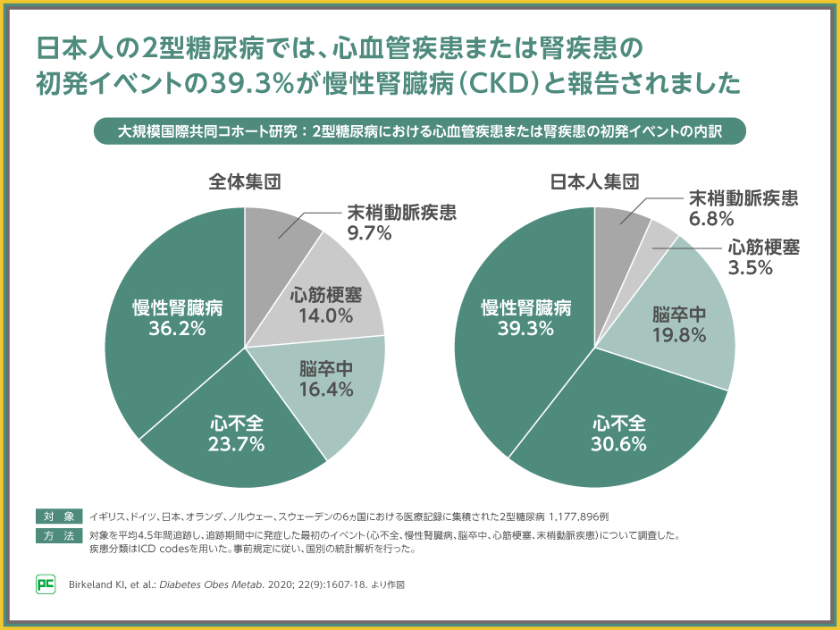 図は、2020年に報告された2型糖尿病を対象とした大規模国際共同コホート研究における心血管疾患または腎疾患の初発イベントの内訳です。全体集団と日本人集団の両方で、慢性腎臓病が最も多く、次いで心不全であるという結果が得られ、日本人集団での慢性腎臓病は39.3%でした。