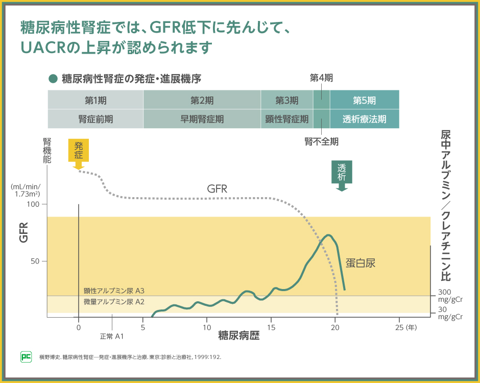 早期腎症期は尿中アルブミン/クレアチニン比(UACR)が上昇し、微量アルブミン尿(UACR≧30mg/gCr)が認められることから、早期腎症期では、UACRの把握が重要となります。