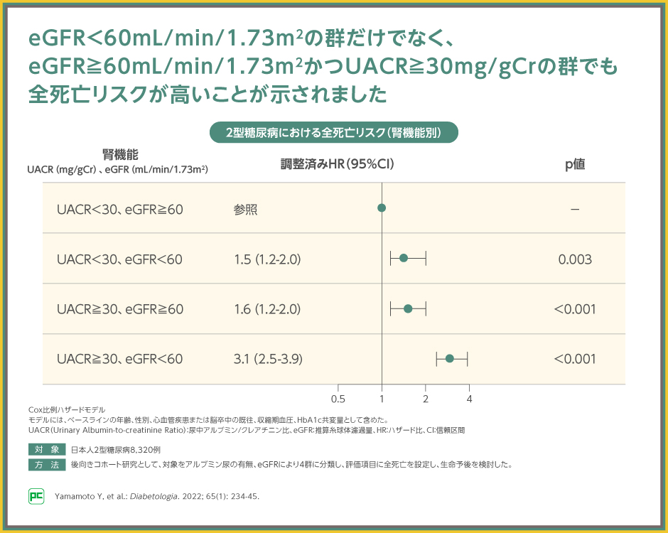 eGFRとUACRで群別し、eGFR≧60(mL/min/1.73m2)かつUACR<30(mg/gCr)の群とその他の群を比較した結果、eGFRが低下したeGFR<60かつUACR<30の群およびeGFR<60かつUACR≧30の群だけでなく、eGFRは変わらずUACRが上昇したeGFR≧60かつUACR≧30の群でも全死亡リスクが高かったと報告されました(それぞれp=0.003、p<0.001、p<0.001、いずれもCox比例ハザードモデル)。