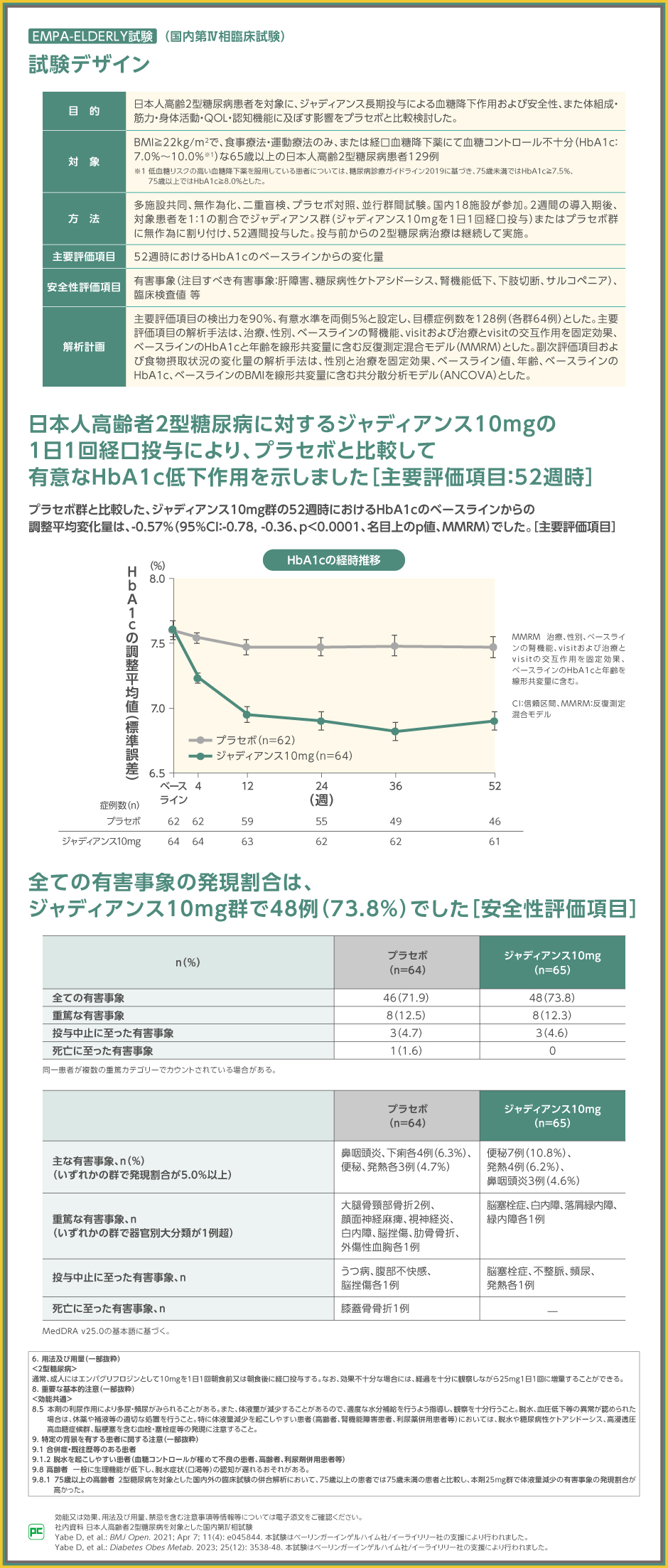 プラセボ群と比較したジャディアンス10mg群の52週時のHbA1cのベースラインからの調整平均変化量は-0.57%であり、ジャディアンス10mg群で有意なHbA1c低下作用を示し[p<0.0001(名目上のp値)、MMRM]、日本人高齢者2型糖尿病においてジャディアンス10mg 1日1回経口投与による血糖改善効果が確認されました。