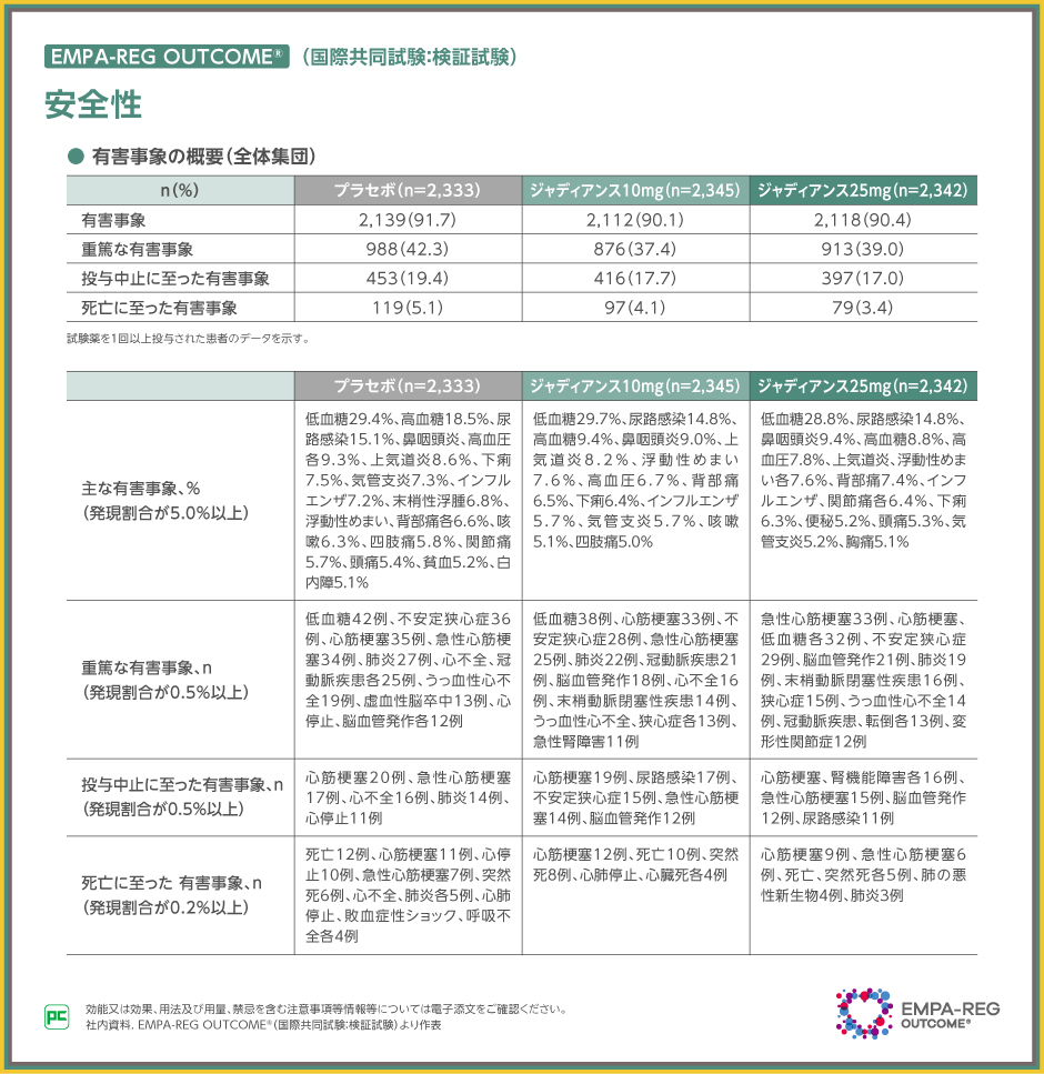 主な有害事象は、ジャディアンス10mg群で低血糖29.7%、尿路感染14.8%、高血糖9.4%等、25mg群で低血糖28.8%、尿路感染14.8%、鼻咽頭炎9.4%等、プラセボ群で低血糖29.4%、高血糖18.5%、尿路感染15.1%等でした。また、重篤な有害事象は、ジャディアンス10mg群で低血糖38例、心筋梗塞33例、不安定狭心症28例等、25mg群で急性心筋梗塞33例、心筋梗塞、低血糖各32例等、プラセボ群で低血糖42例、不安定狭心症36例、心筋梗塞35例等でした。投与中止、死亡に至った有害事象は表のとおりでした。
