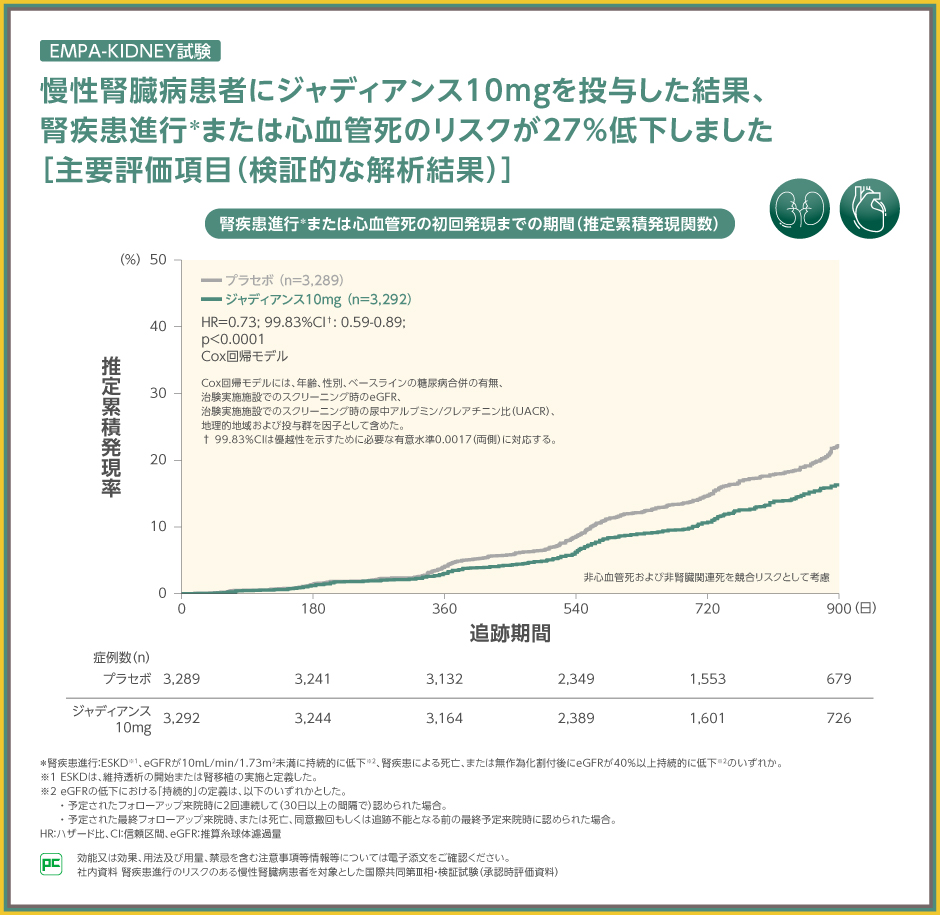本試験の主要評価項目である腎疾患進行または心血管死のプラセボ群に対するハザード比は0.73で、イベントリスクが27%低下し、ジャディアンス10mg群の優越性が検証されました(99.83%CI:0.59~0.89、p<0.0001、Cox回帰モデル)。
