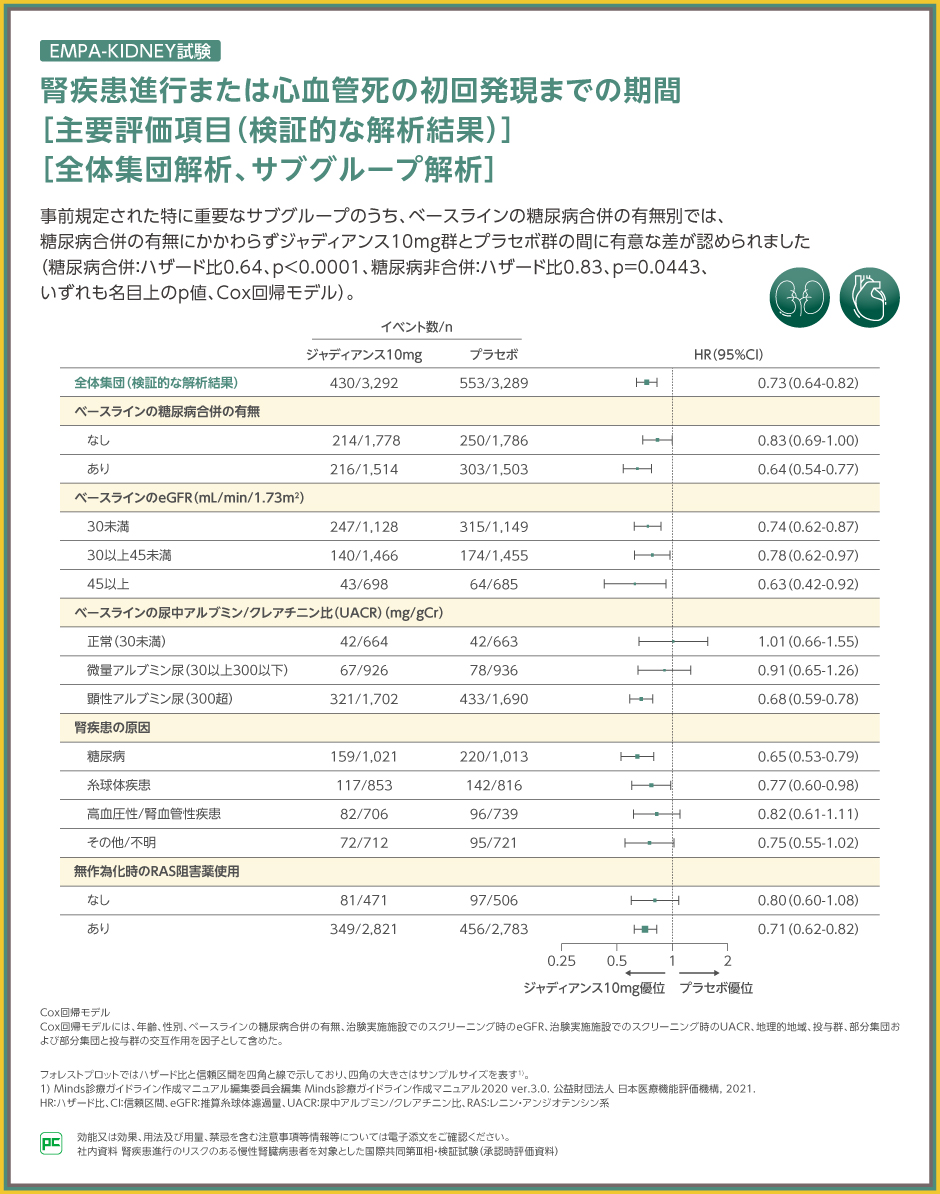 主要評価項目について事前規定されたサブグループ解析を行った結果、糖尿病合併の有無にかかわらず、プラセボ群と比較してジャディアンス10mg群の腎疾患進行または心血管死のリスクが低下しました(糖尿病合併:ハザード比0.64、p<0.0001、糖尿病非合併:ハザード比0.83、p=0.0443、いずれも名目上のp値、Cox回帰モデル)。