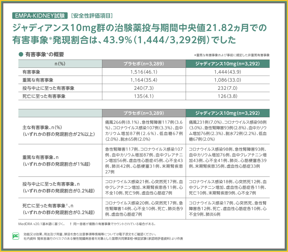 主な有害事象は、ジャディアンス10mg群で痛風231例(7.0%)、コロナウイルス感染98例(3.0%)、急性腎障害93例(2.8%)等、プラセボ群で痛風266例(8.1%)、急性腎障害117例(3.6%)、コロナウイルス感染107例(3.3%)等でした。また、重篤な有害事象は、ジャディアンス10mg群でコロナウイルス感染98例、急性腎障害93例、血中カリウム増加76例等、プラセボ群で急性腎障害117例、コロナウイルス感染107例、血中カリウム増加87例等でした。投与中止、死亡に至った有害事象は表のとおりでした。