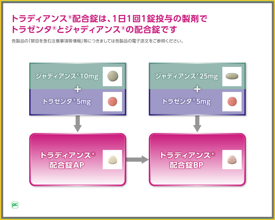 ジャディアンスは、2型糖尿病治療を目的とする場合、10mg錠と25mg錠での用量調整が可能であり※、またDPP-4阻害薬トラゼンタとの合剤であるトラディアンス配合錠をお使いいただければ、1日1回1錠のままで、治療強化が可能です。
