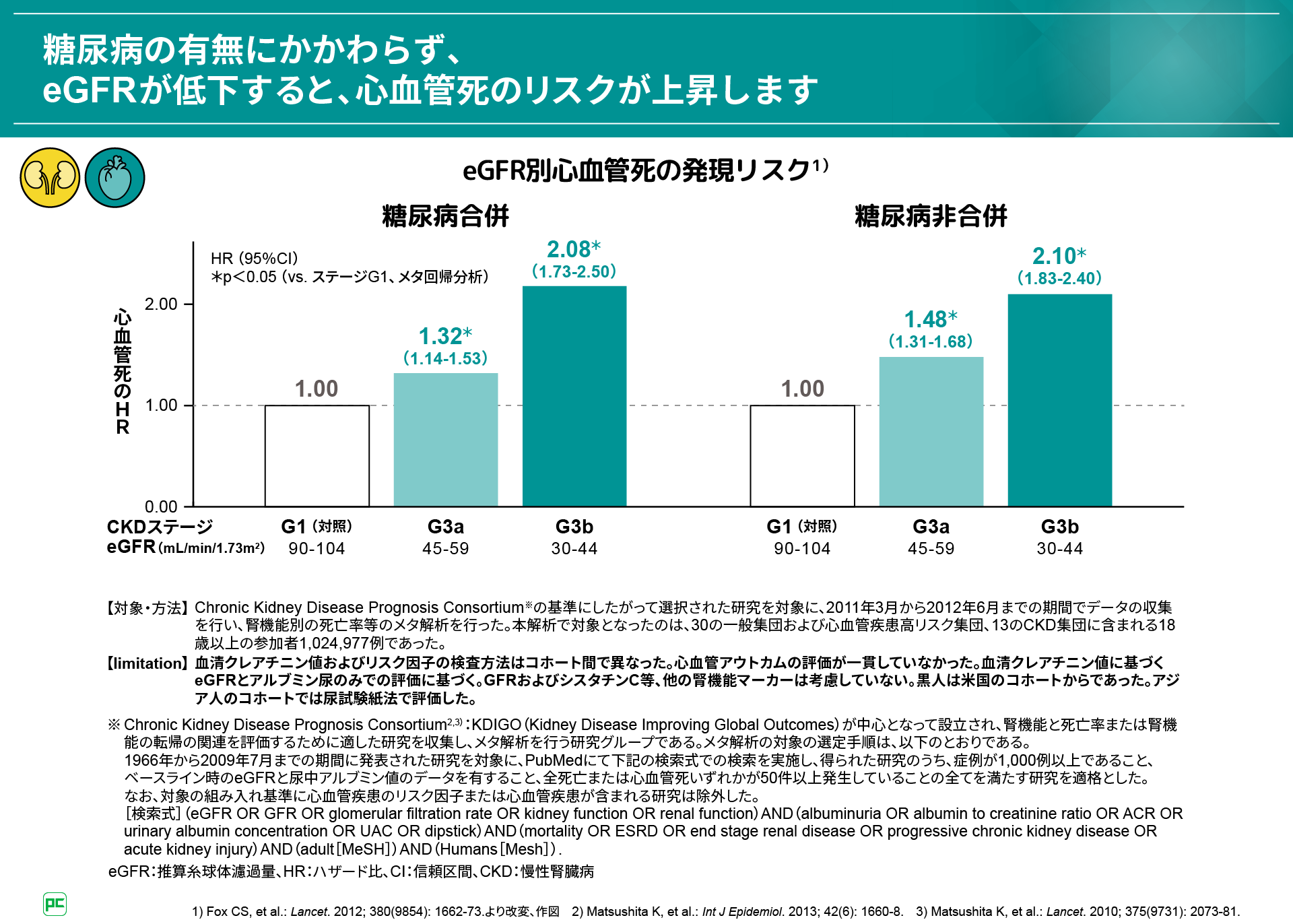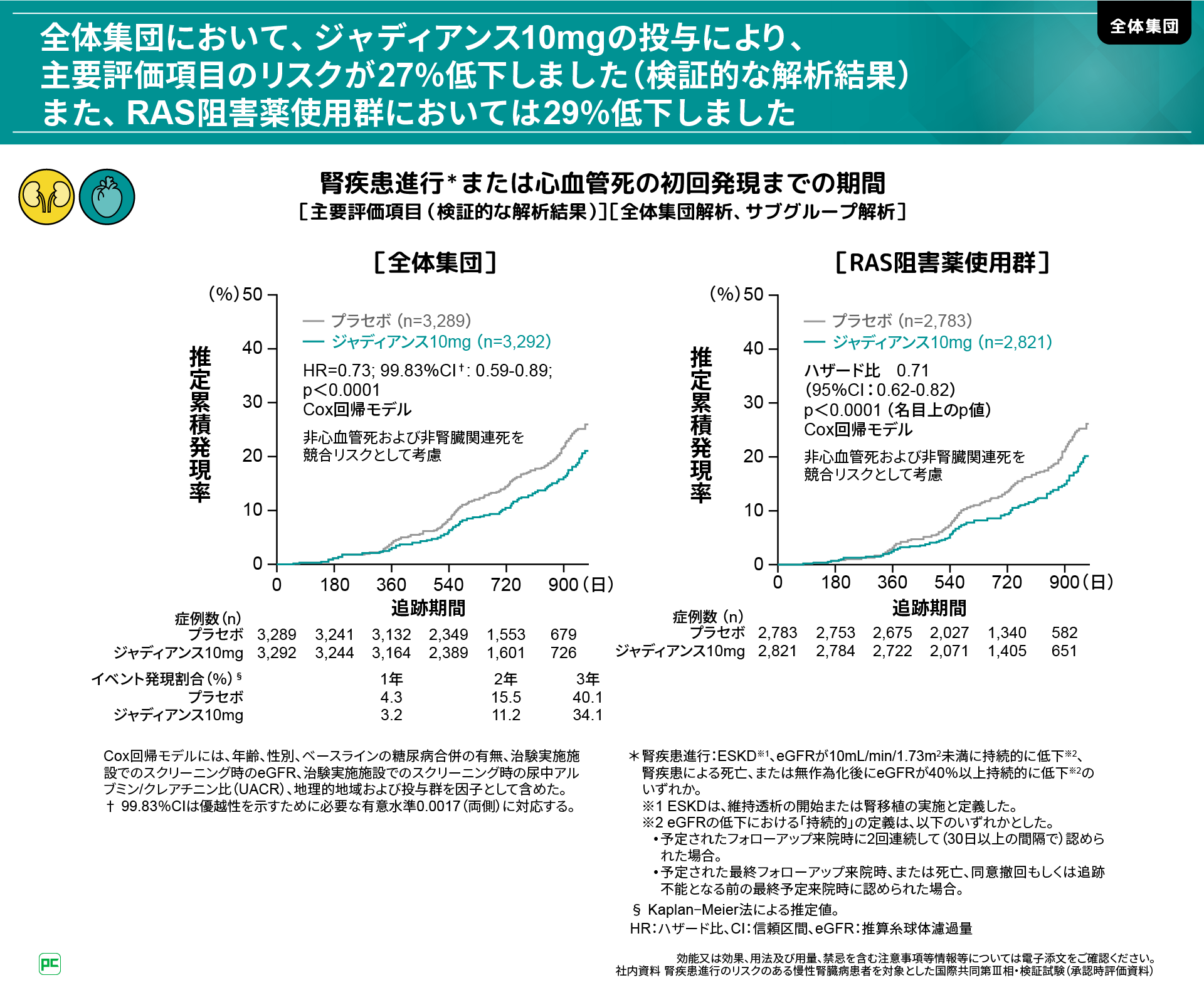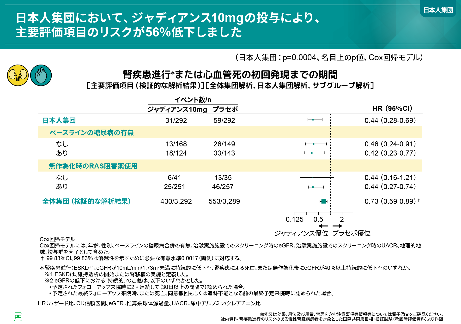 CKDでは、日本人を含むアジア人において、欧米人と比較してeGFR低下速度が速く、末期腎不全(腎代替療法)への進行リスクが高いという報告もあることから1)、国際共同試験の全体集団の結果だけでなく、日本人における有効性および安全性も治療選択の一助となるのではないでしょうか。