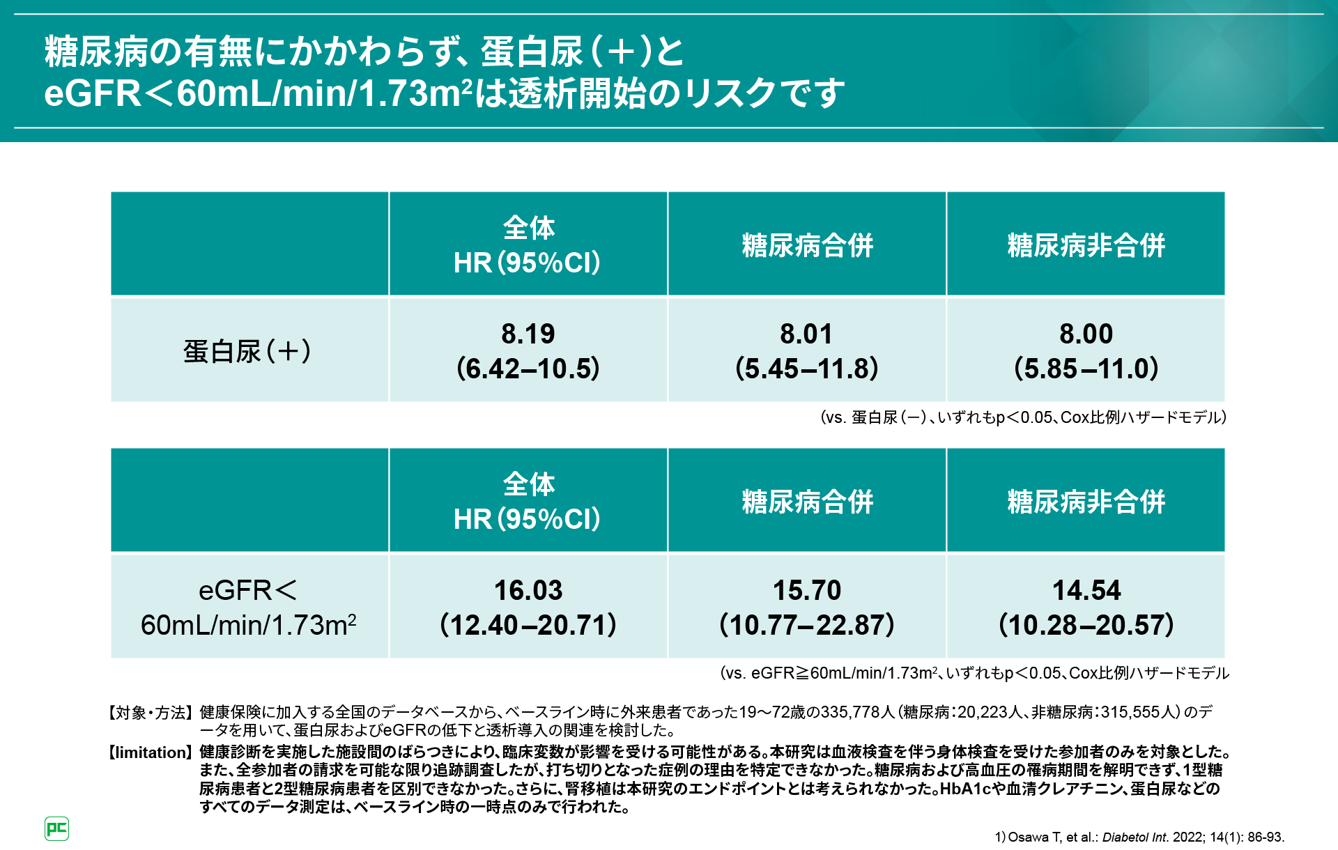 蛋白尿とeGFRの低下による透析導入リスクを検討した日本の研究では、糖尿病非合併群においても、蛋白尿(+)とeGFR<60mL/min/1.73m2が透析導入の独立した予測因子だったことが報告されています。