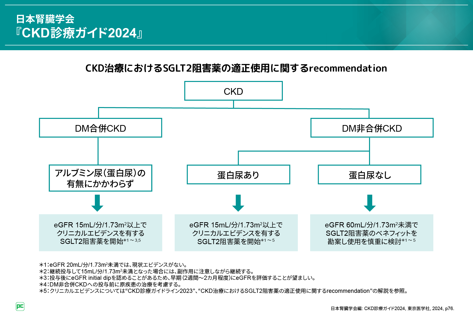 先生のご選択のとおり、『CKD診療ガイド2024』では、CKD患者に対しては、糖尿病非合併であっても蛋白尿がみられる場合、SGLT2阻害薬を開始するとされています。