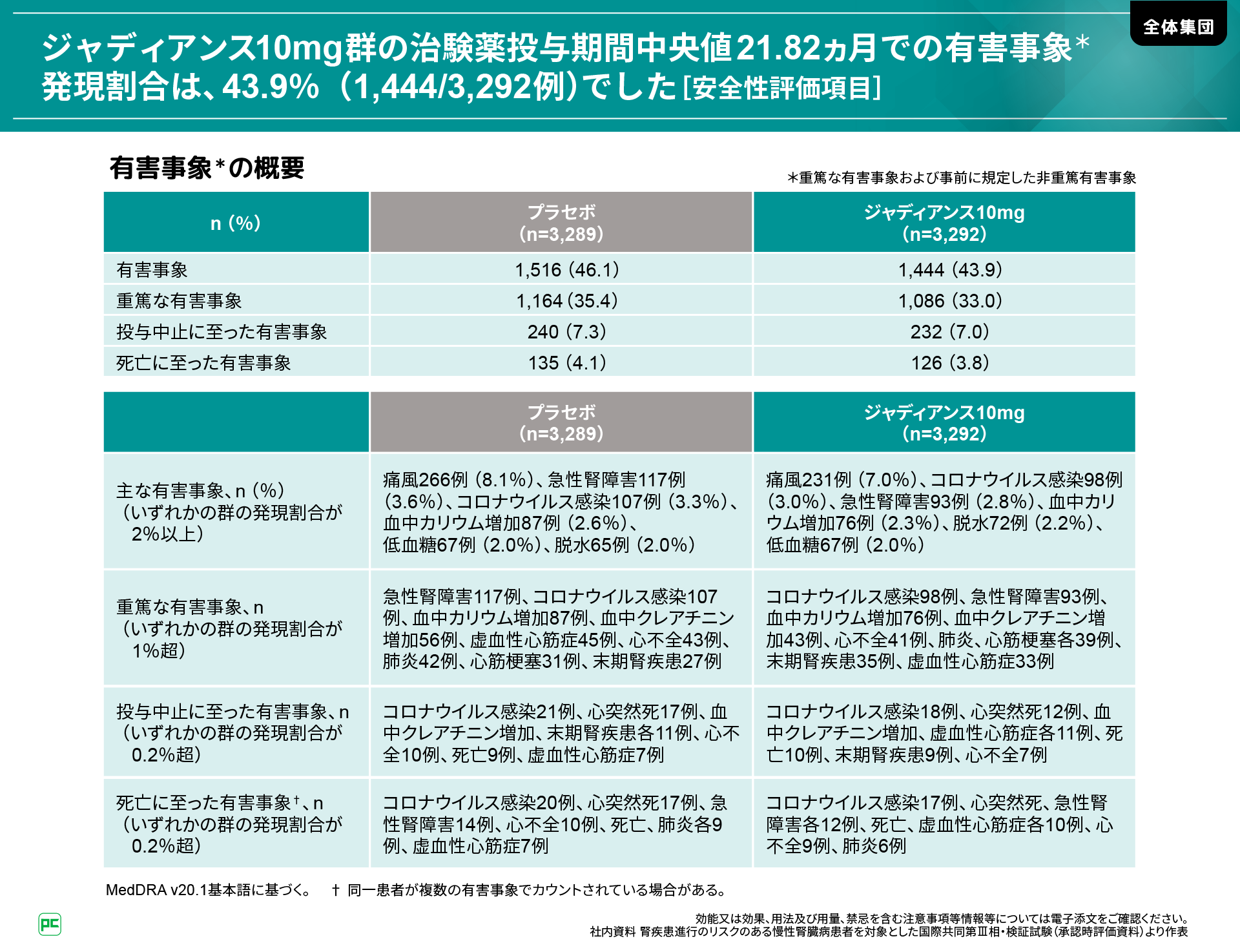 主な有害事象は、ジャディアンス10mg群で痛風231例(7.0%)、コロナウイルス感染98例(3.0%)、急性腎障害93例(2.8%)等、プラセボ群で痛風266例(8.1%)、急性腎障害117例(3.6%)、コロナウイルス感染107例(3.3%)等でした。