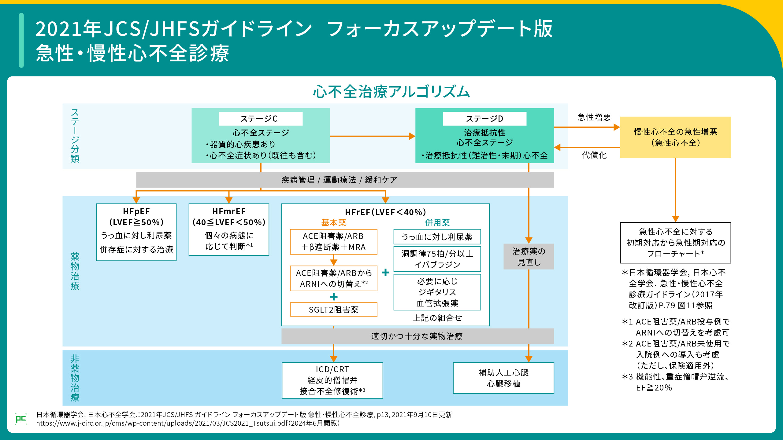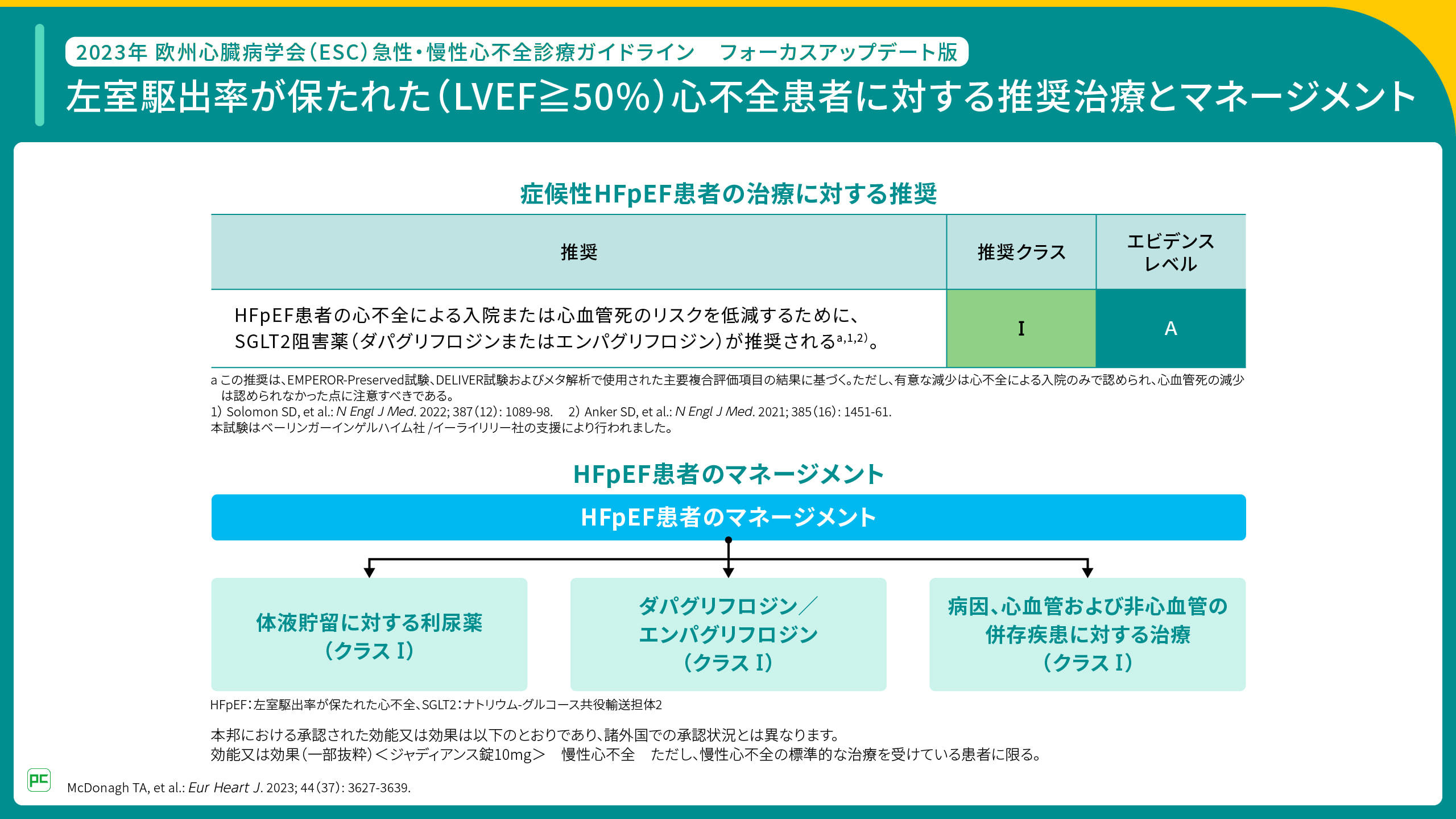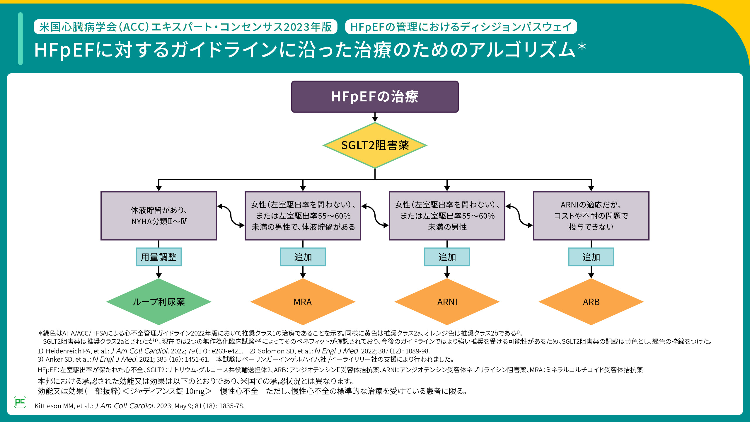 https://www.j-circ.or.jp/cms/wp-content/uploads/2023/06/jcs_jhfs_Recommendation_SGLT2_Inhibitors__HF.pdf(2024年6月閲覧) - Kittleson MM, et al. J Am Coll Cardiol. 2023; 81(18): 1835-1878.