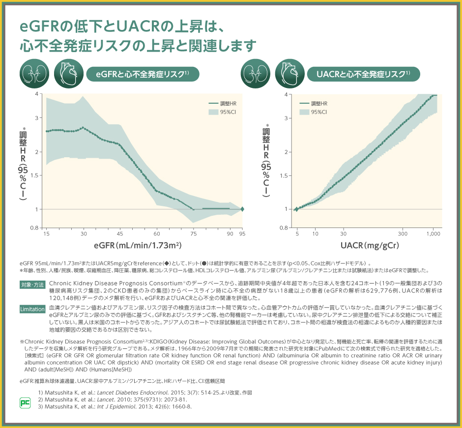 腎機能の低下や蛋白尿およびアルブミン尿の存在は、将来の透析導入のリスクとなるだけではなく、心不全発症リスクの上昇とも関連することが示されています。