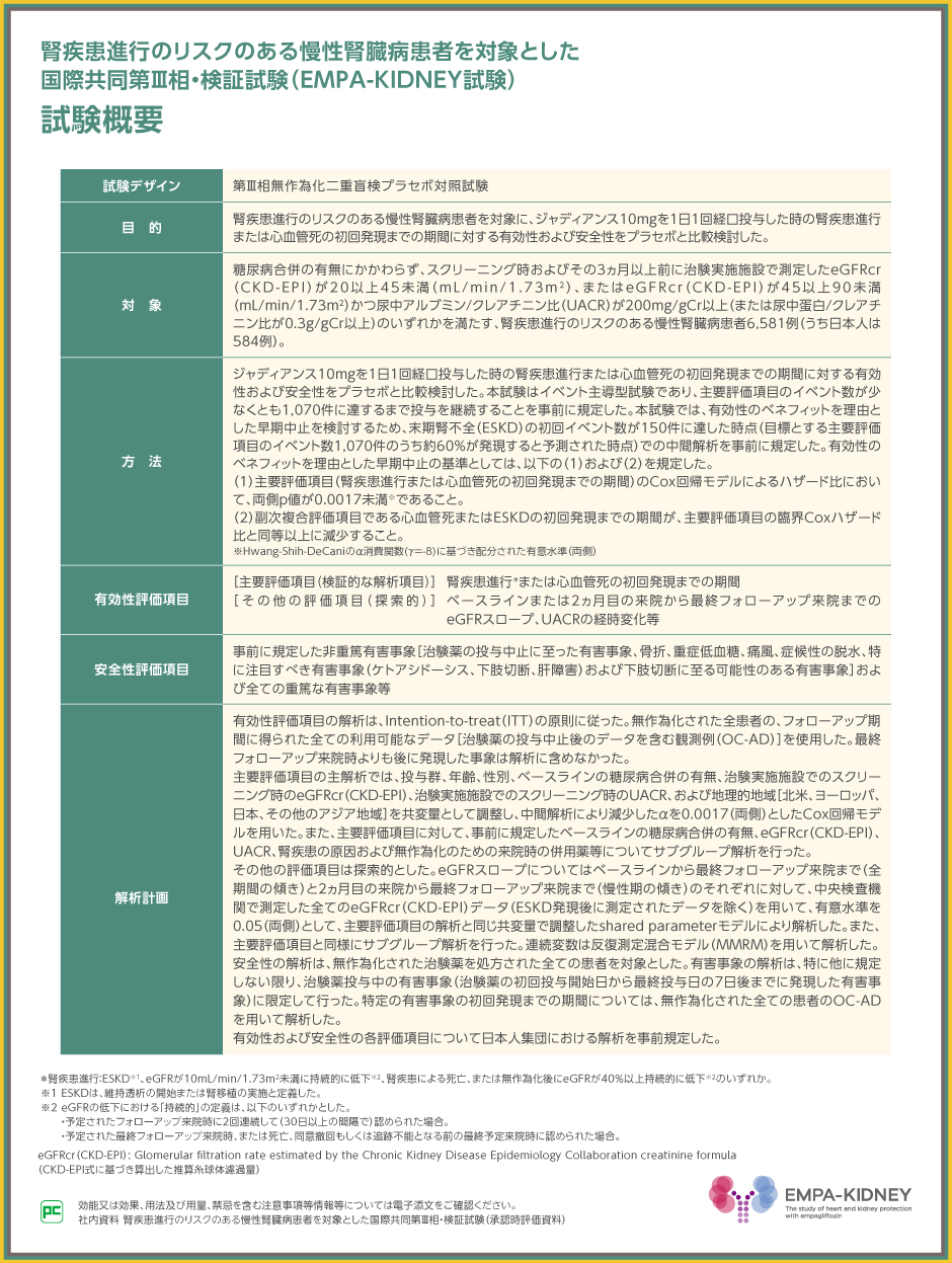 ジャディアンスは、EMPA-KIDNEY試験において、2型糖尿病の有無を問わず、進行性のCKD患者に対して、1日1回経口投与した時の有効性と安全性が報告されました。