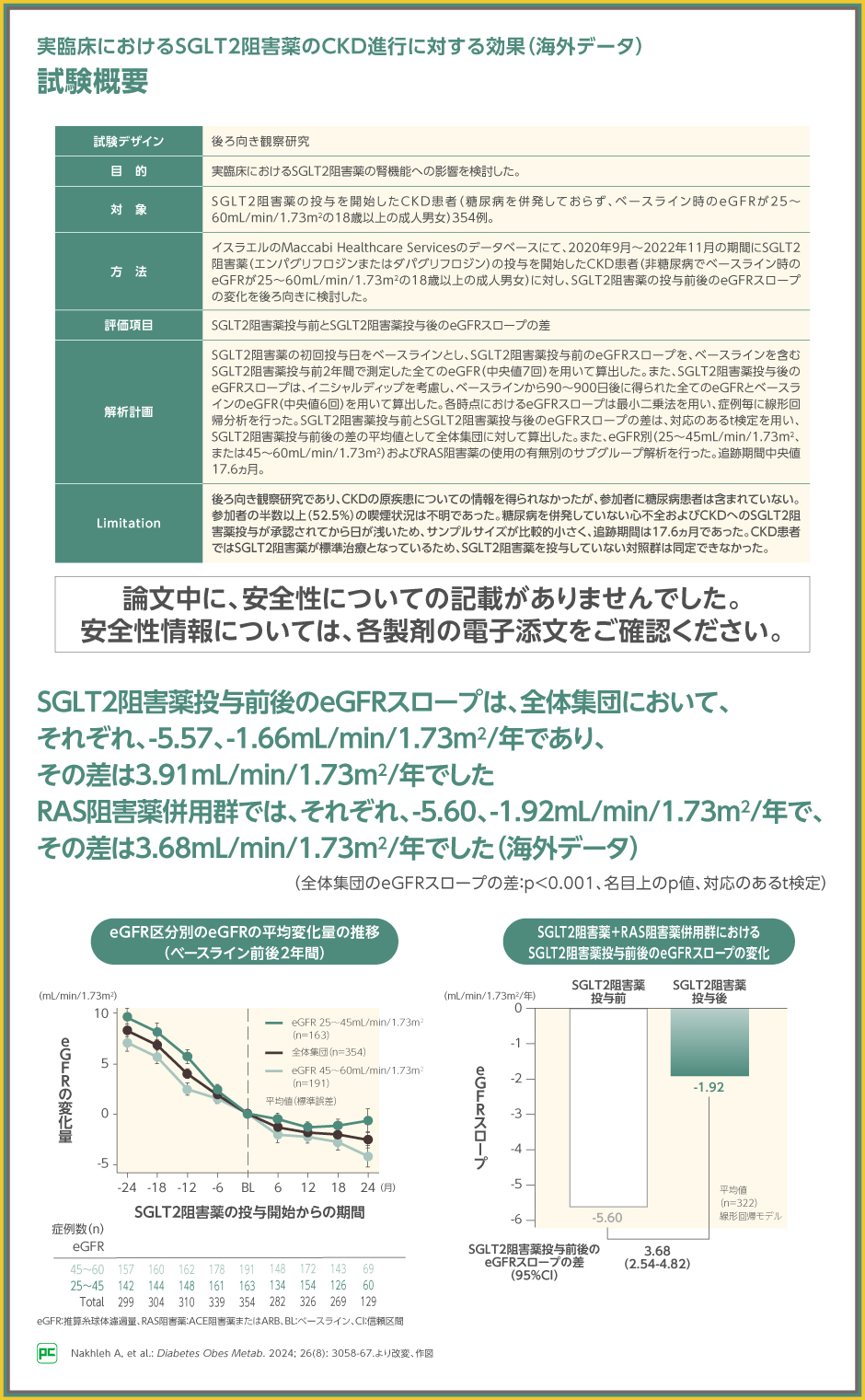 さらに、RAS阻害薬併用群でのサブグループ解析におけるeGFRスロープはSGLT2阻害薬投与前で-5.60mL/min/1.73m2/年であったのに対して、投与後は-1.92mL/min/1.73m2/年でした。
