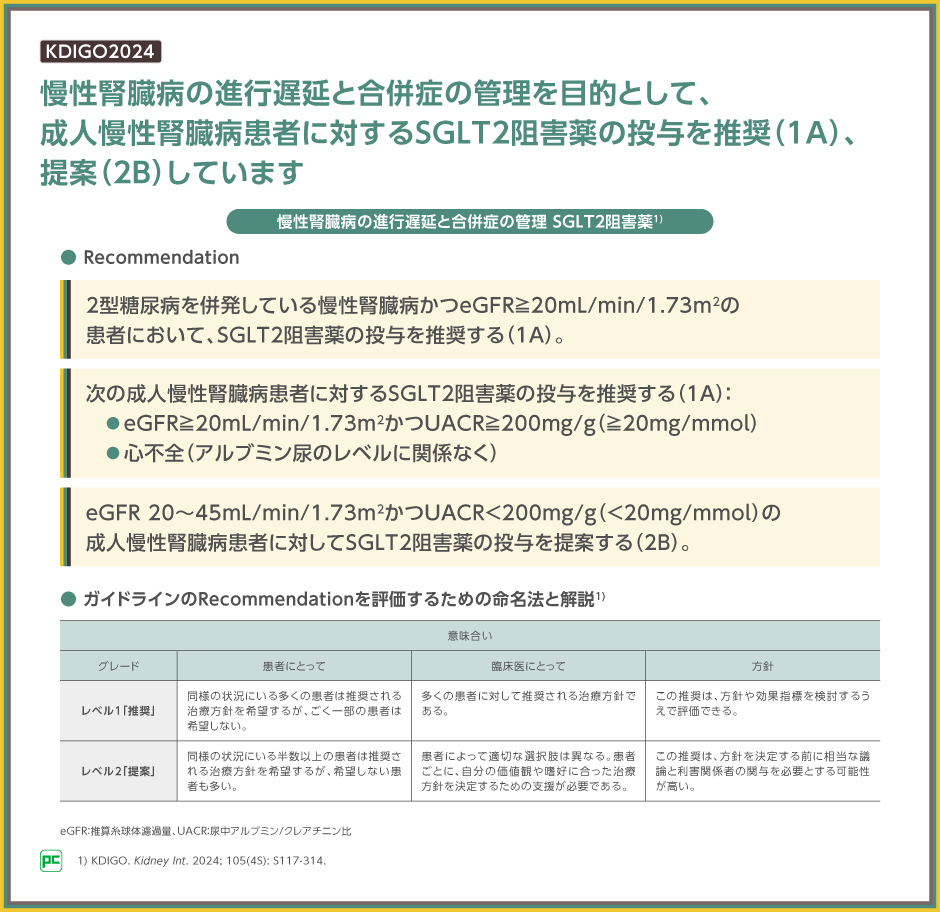 また、KDIGO2024では、「eGFR 20~45mL/min/1.73m2かつUACR<200mg/g(<20mg/mmol)の成人慢性腎臓病患者に対してSGLT2阻害薬の投与を提案する(2B)」としています。