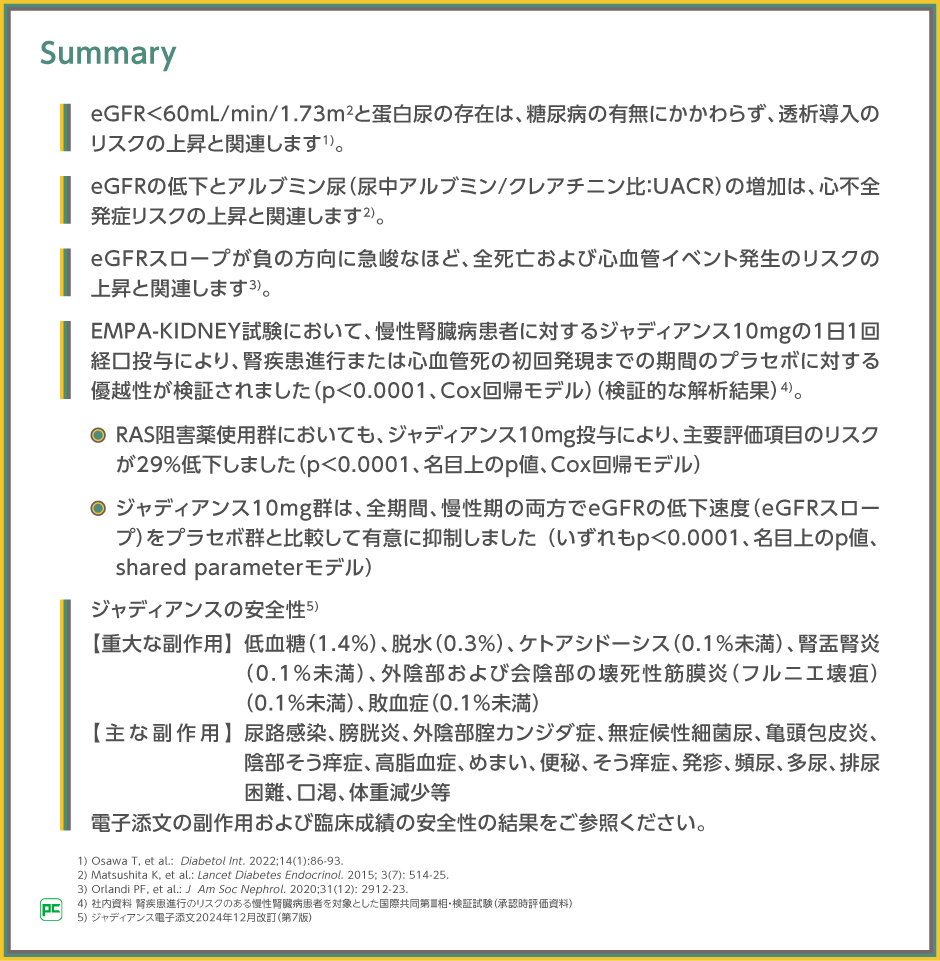 こうしたリスクをできるだけ回避するために、腎機能評価としてはeGFRだけではなく、蛋白尿の存在も注視し、早期から積極的なCKD治療を行うことが大切です。そして、その治療選択肢としてはジャディアンスを始めとしたSGLT2阻害薬がその一つになると考えます。