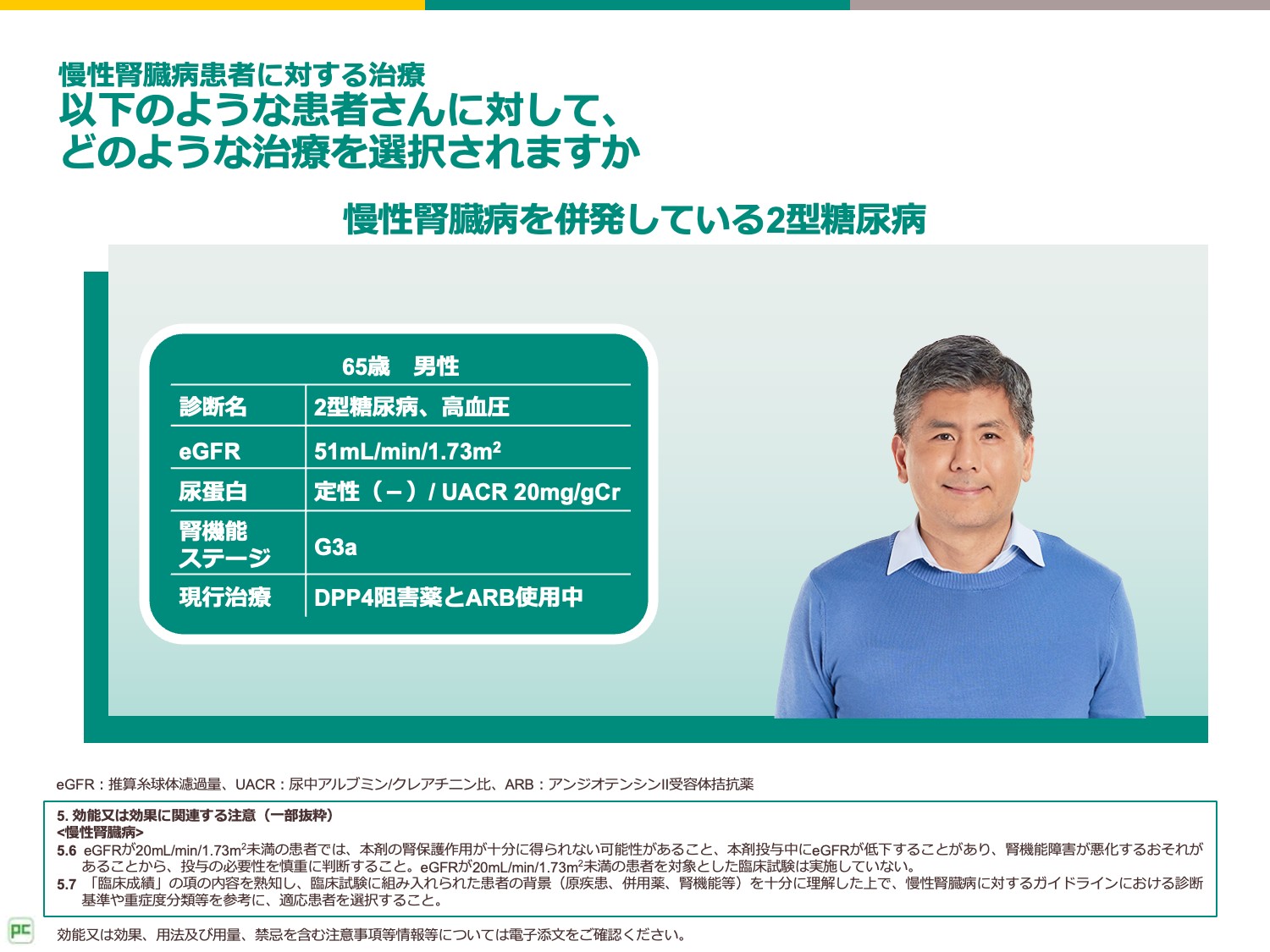 こちらは2型糖尿病と高血圧を合併するCKDステージG3aの患者さんです。