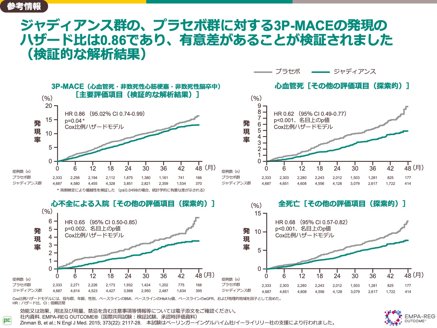 そして副次評価項目である心血管死、全死亡、心不全による入院、これらいずれの項目においても、プラセボ群に対してジャディアンス群で有意なイベントリスク抑制を示しました。