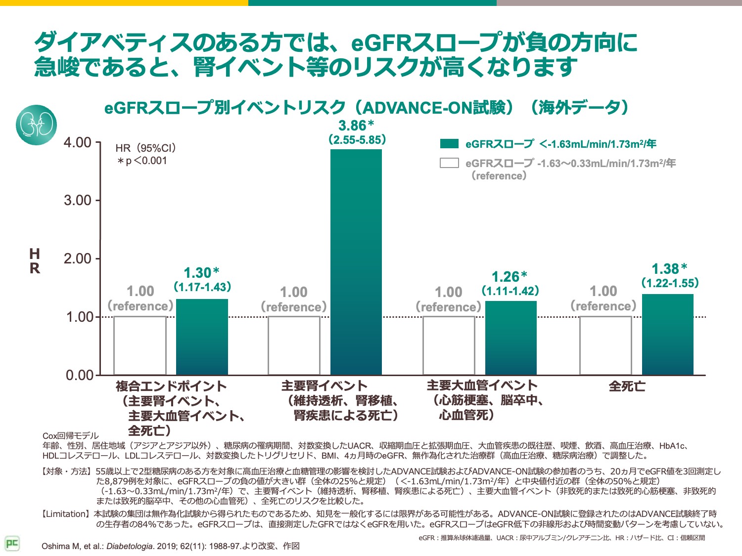 また、ADVANCE試験およびADVANCE-ON試験に参加した8879例の参加者のeGFRスロープを観察し、イベントリスクとの相関をみたデータを紹介します。