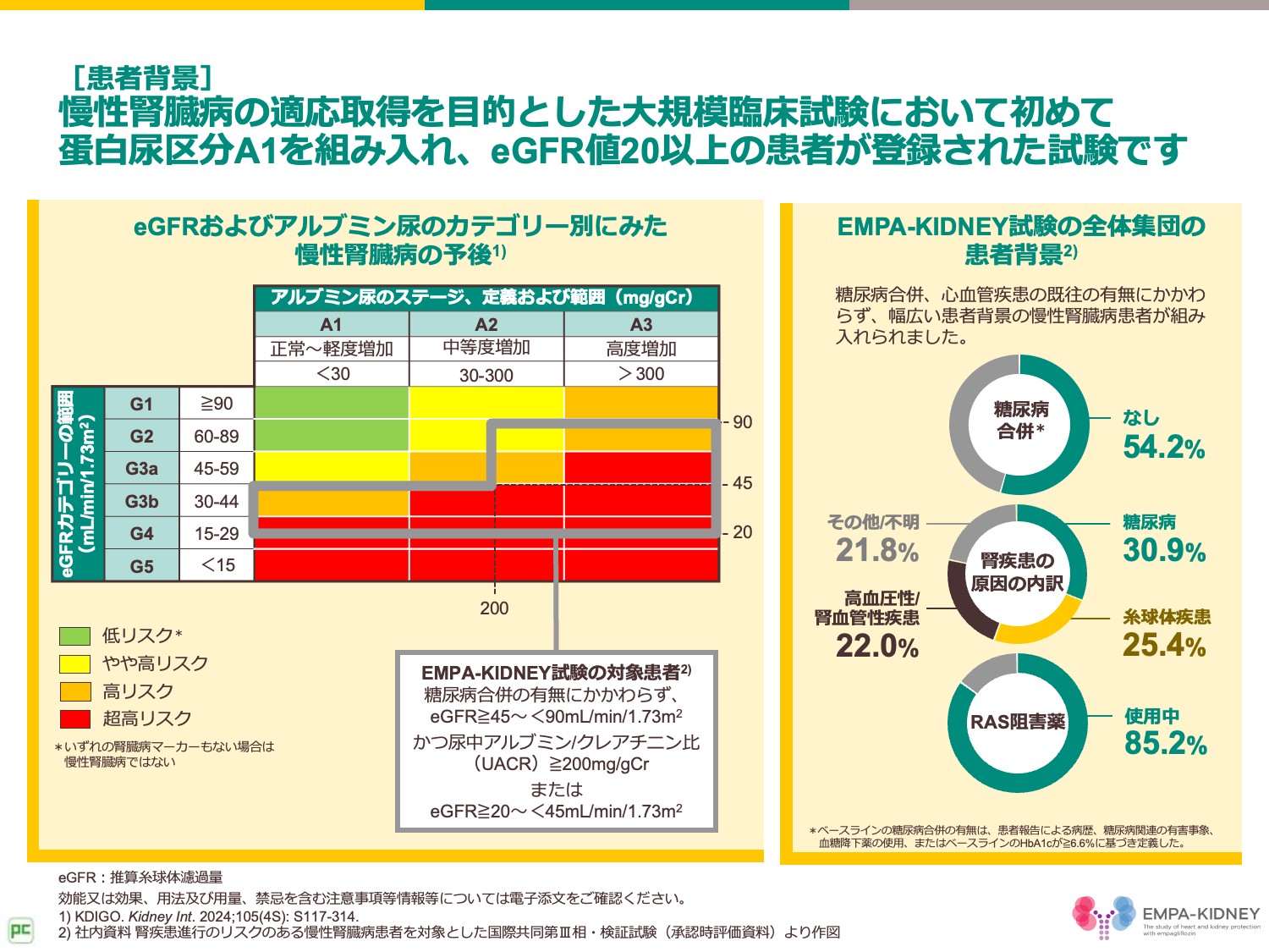 本試験の特性として注目いただきたい点は、慢性腎臓病の適応取得を目的とした大規模臨床試験において初めて蛋白尿区分A1を組み入れ、eGFR値20以上の患者が登録された点です。