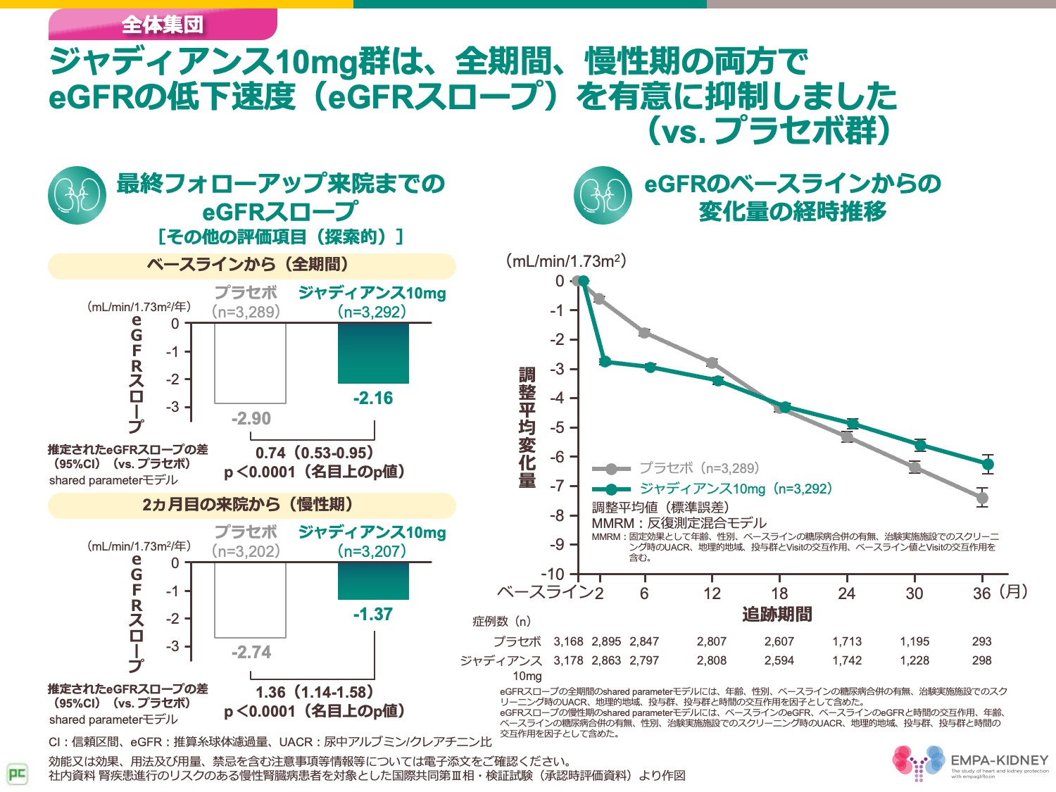 全期間におけるeGFRスロープは、プラセボ群に比べてジャディアンス10mg群で0.74mL/min/1.73m2/年と有意に負の傾きを緩やかにしました。