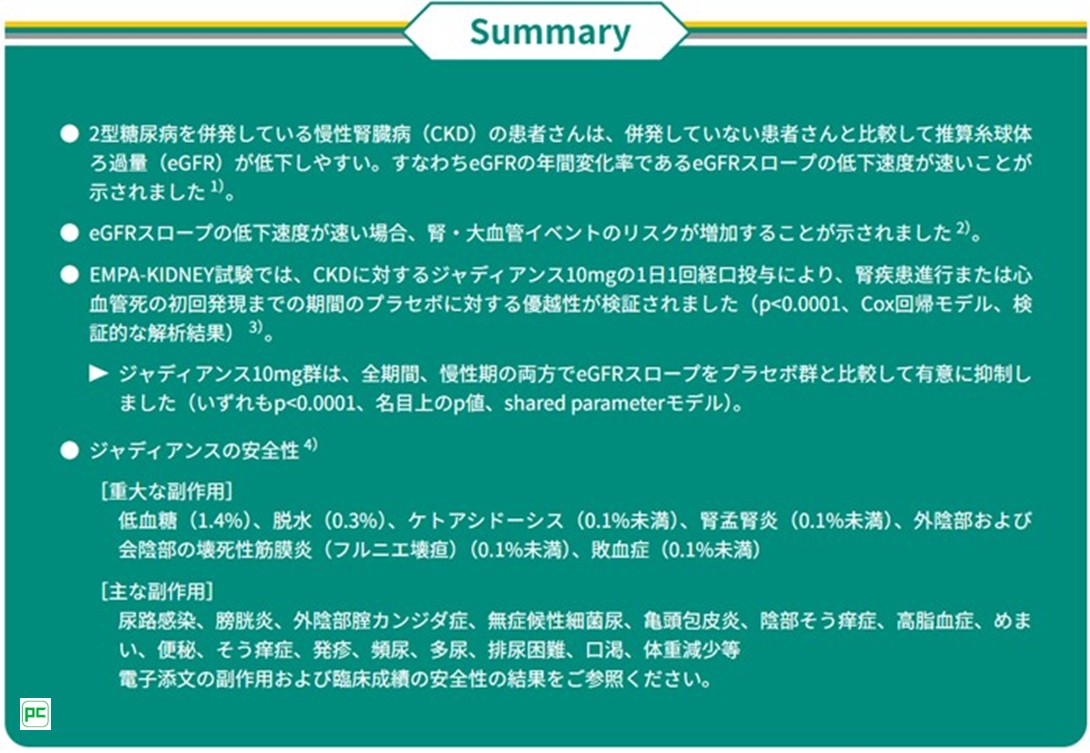 今回は2型糖尿病を併発した慢性腎臓病患者さんにおける腎機能と心血管イベントリスクとの関連性および、EMPA-KIDNEY試験、EMPA-REG OUTCOME試験についてご紹介しました。