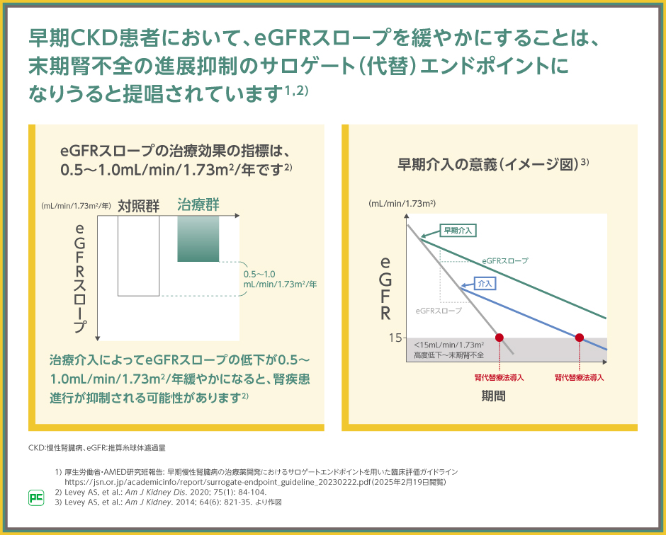 適切な治療介入により、eGFRスロープの低下が0.5~1.0mL/min/1.73m2/年緩やかになれば、腎疾患進行を抑制される可能性があります。