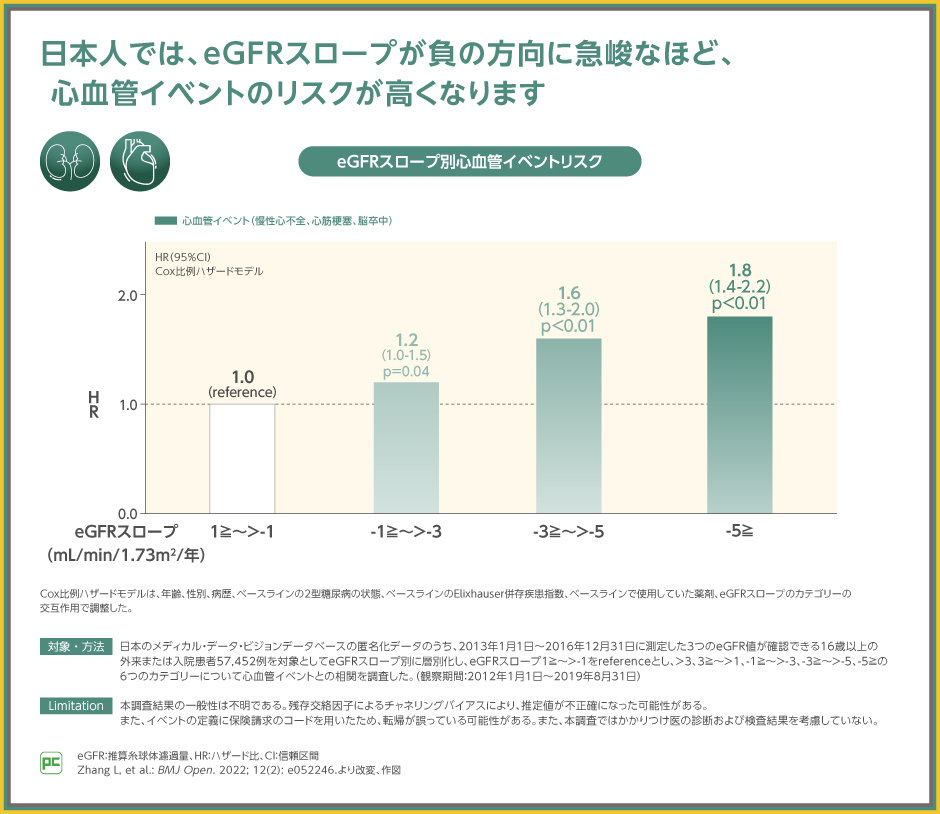 実際に、eGFRスロープが急峻なほど(eGFRのスロープの負の値が大きいほど)、心血管イベントリスクが高くなることは、日本人を対象とした疫学調査でも報告されています。