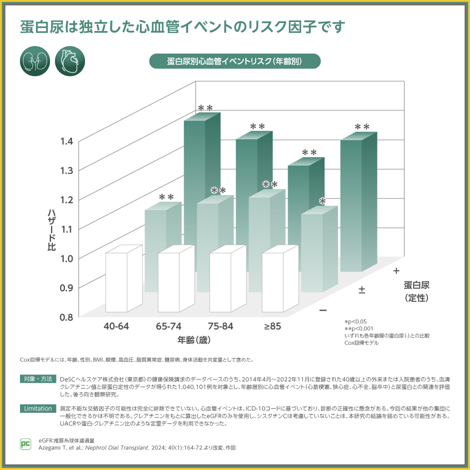 また、軽度でも蛋白尿があることは、心血管イベントのリスク因子になります。