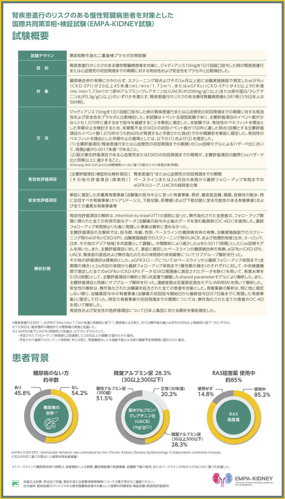 ジャディアンスでは、EMPA-KIDNEY試験において、腎疾患進行リスクのある慢性腎臓病患者に対して、1日1回経口投与により、主要評価項目である腎疾患進行または心血管死の初回発現までの期間やeGFRスロープの変化などに対する有効性および安全性を検討しました。