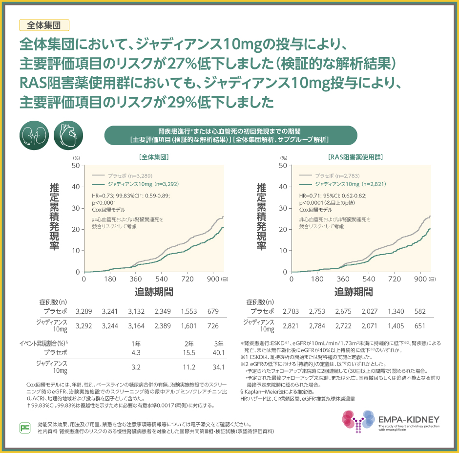EMPA-KIDNEY試験の結果、主要評価項目のプラセボ群に対するジャディアンス10mg群のハザード比は0.73(99.83%CI:0.59~0.89)、p<0.0001(Cox回帰モデル)であり、ジャディアンス10mg群の優越性が検証されました。
