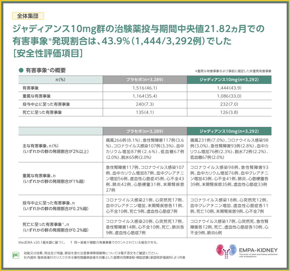 主な有害事象は、ジャディアンス10mg群で痛風7.0%、コロナウイルス感染3.0%、急性腎障害2.8%等でした。