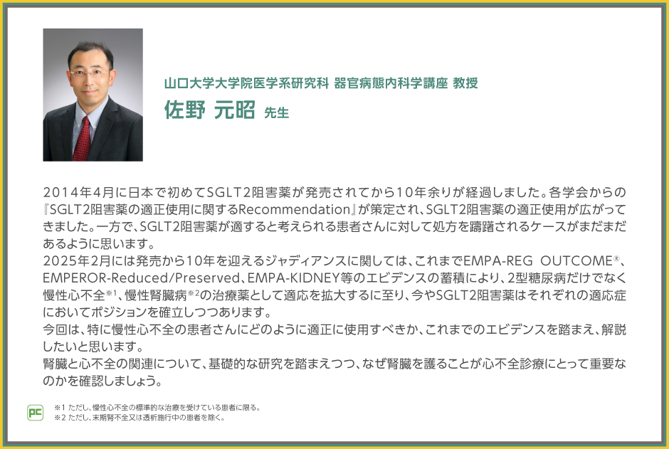 山口大学 佐野元昭先生に、心腎連関に対するSGLT2阻害薬の作用機序を中心に、SGLT2阻害薬の一つであるジャディアンスの10年のエビデンスをご解説いただきました。