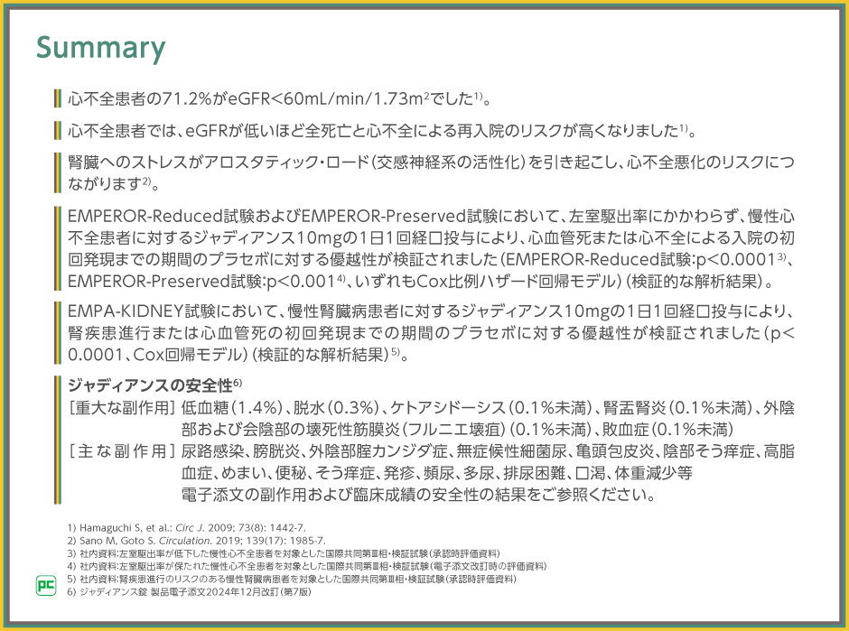 また、EMPA-KIDNEY試験により、2型糖尿病を併発していない慢性腎臓病に対する有効性も評価されました。