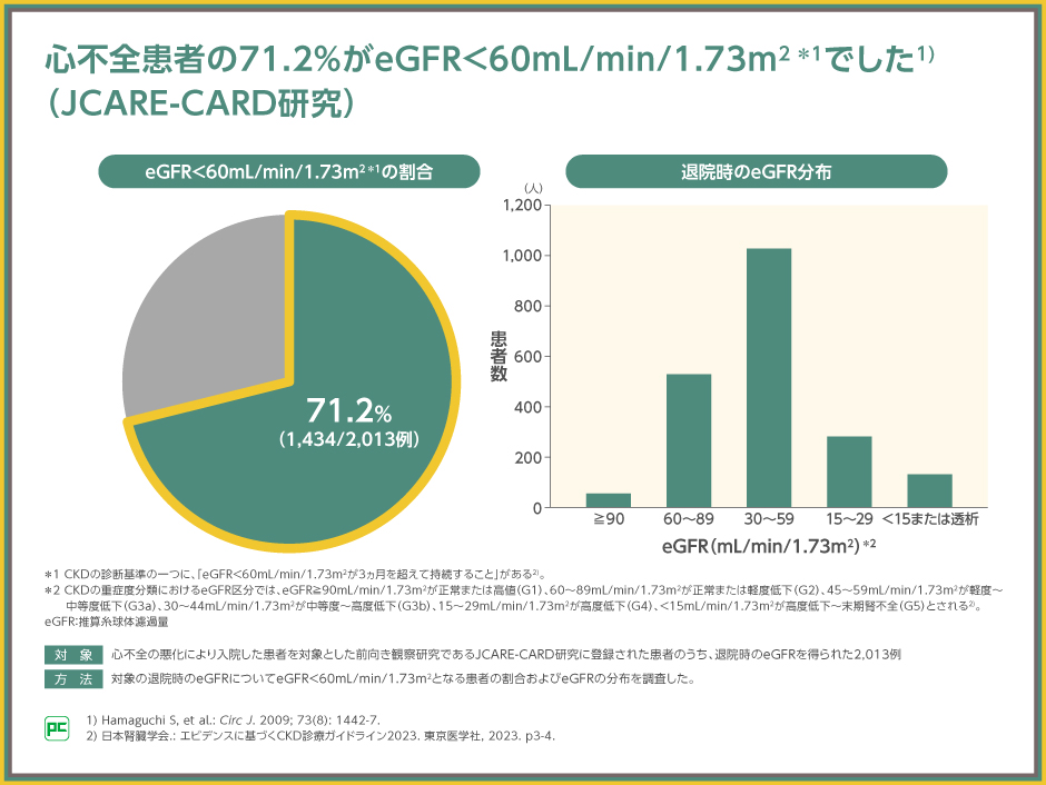 JCARE-CARD研究では、心不全患者の71.2%がeGFR<60mL/min/1.73m2であると報告されました。eGFR<60mL/min/1.73m2はCKDステージG3a以降に該当することから3)、心不全患者の7割で腎機能が低下した状態であったことを示します。
