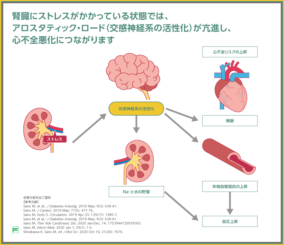 心不全患者では、血行動態の悪化により、腎臓にかかるストレスが増大します。腎臓にストレスがかかっているという情報は、求心性神経を介して脳へと伝達され、アロスタティック・ロードを引き起こします。アロスタティク・ロードが長期化すると、血管収縮や、ナトリウムと水分の貯留、頻脈、血圧上昇等を呈して、心不全の悪化につながります。