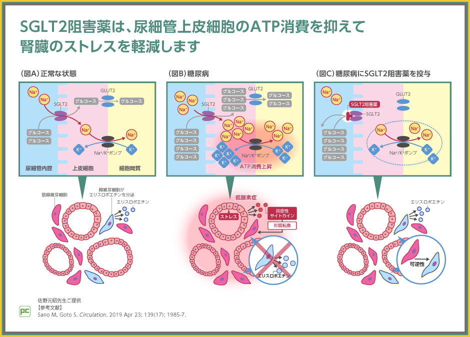 このようなグルコース代謝の異常が生じている状態に対してSGLT2阻害薬を投与すると(図C)、ナトリウムおよびグルコースの過剰な取り込みが阻害されるため、尿細管上皮細胞でのナトリウム-カリウムポンプによるATP消費の抑制と局所的な低酸素状態の解消、炎症性サイトカイン放出の抑制につながります。炎症性サイトカインに曝露されない状態では、筋線維芽細胞は線維芽細胞に戻ることから、エリスロポエチンの産生が再開され、酸素供給につながり、腎臓にかかるストレスが軽減します。