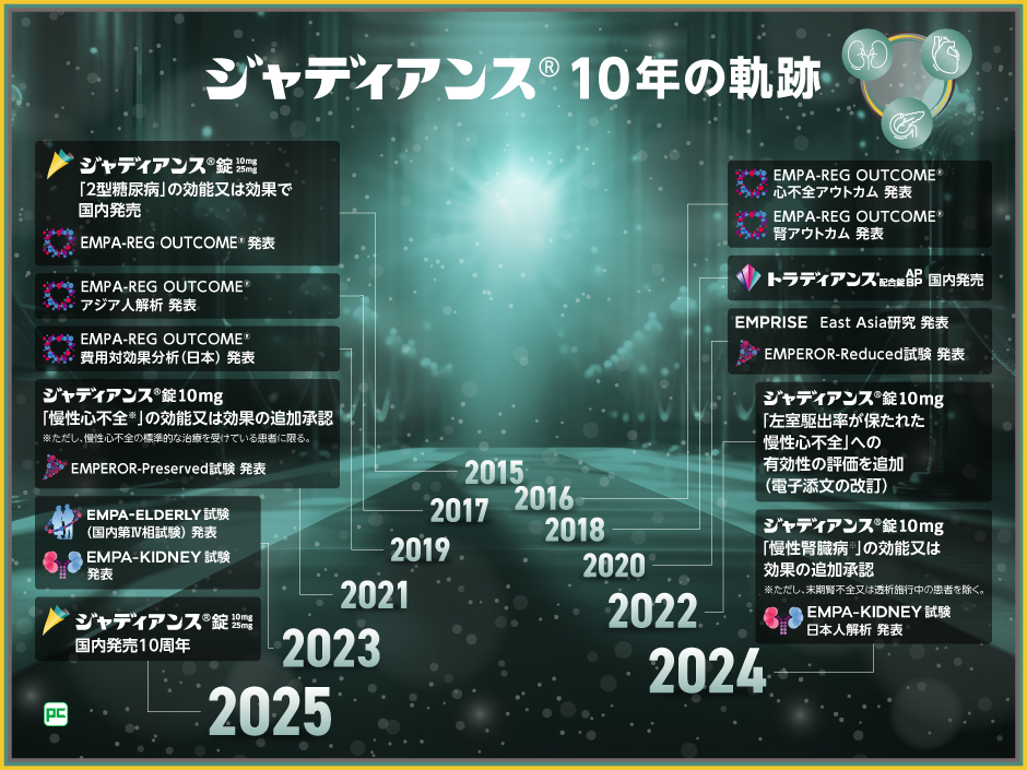 SGLT2阻害薬であるジャディアンスは、2015年に2型糖尿病の治療薬として国内で発売されて以来、EMPA-REG OUTCOME®をはじめとして、様々な臨床試験を行ってきました。